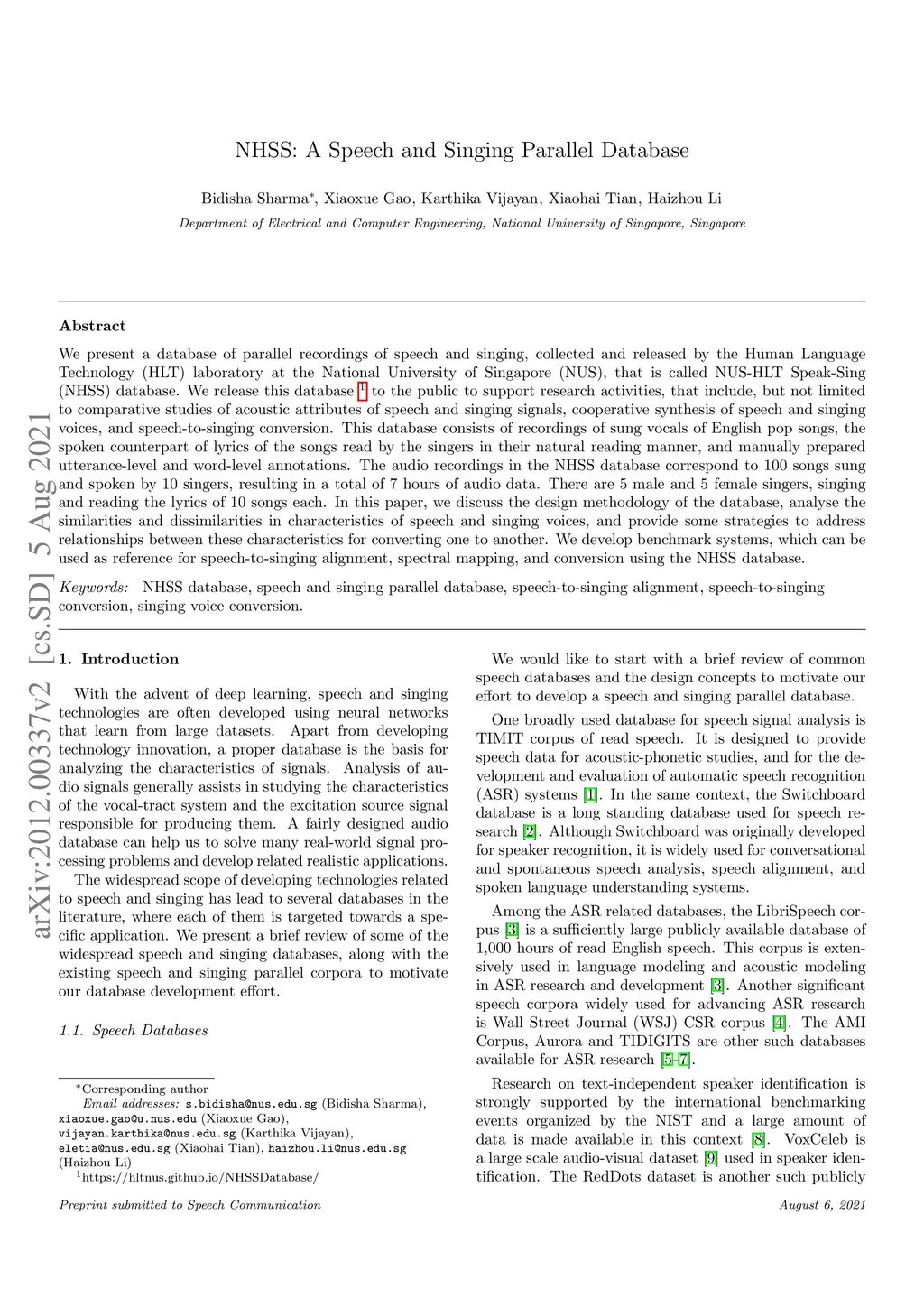 We present a database of parallel recordings of speech and singing, collected and released by the Human Language Technology (HLT) laboratory at the National University of Singapore (NUS), that is called NUS-HLT Speak-Sing (NHSS) database. We release this database to the public to support research activities, that include, but not limited to comparative studies of acoustic attributes of speech and singing signals, cooperative synthesis of speech and singing voices, and speech-to-singing conversion. This database consists of recordings of sung vocals of English pop songs, the spoken counterpart of lyrics of the songs read by the singers in their natural reading manner, and manually prepared utterance-level and word-level annotations. The audio recordings in the NHSS database correspond to 100 songs sung and spoken by 10 singers, resulting in a total of 7 hours of audio data. There are 5 male and 5 female singers, singing and reading the lyrics of 10 songs each. In this paper, we discuss the design methodology of the database, analyse the similarities and dissimilarities in characteristics of speech and singing voices, and provide some strategies to address relationships between these characteristics for converting one to another. We develop benchmark systems, which can be used as reference for speech-to-singing alignment, spectral mapping, and conversion using the NHSS database.