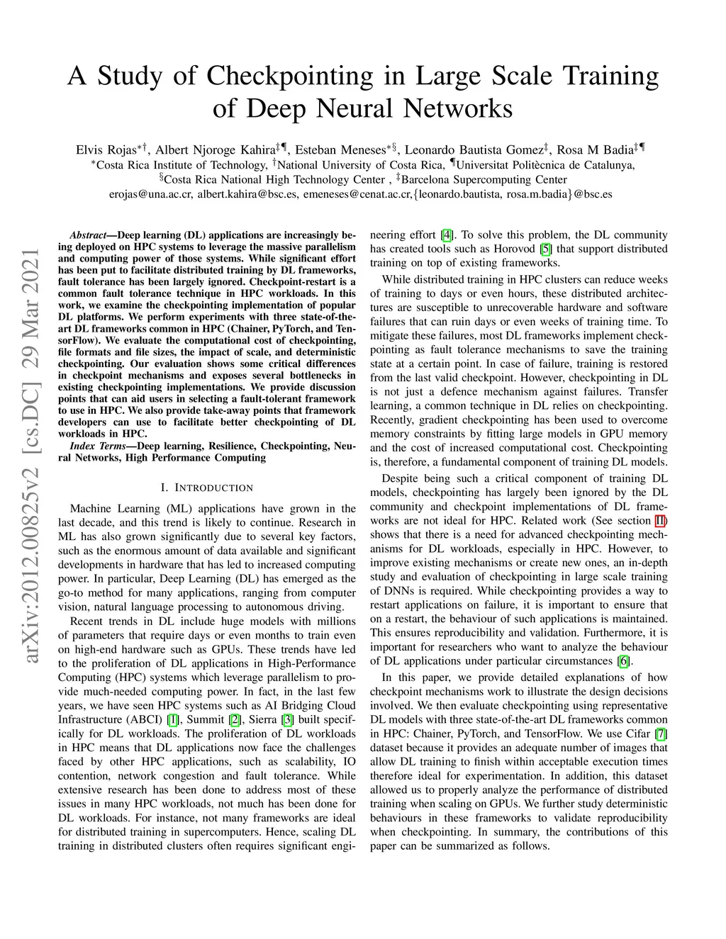 A Study of Checkpointing in Large Scale Training of Deep Neural Networks
