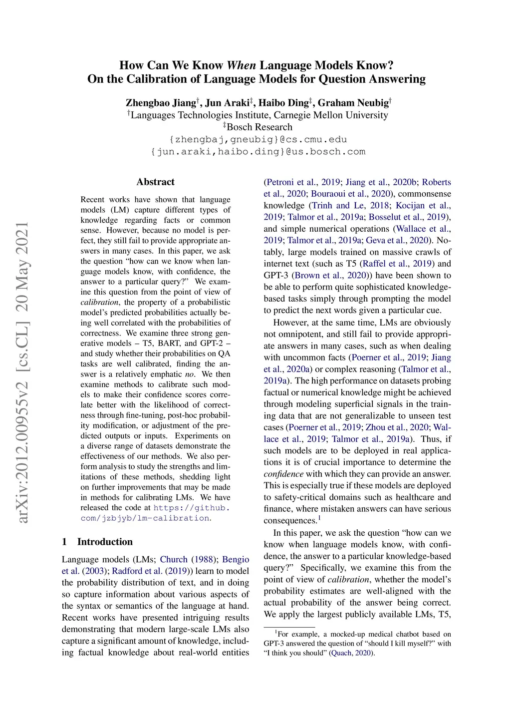 Recent works have shown that language models (LM) capture different types of knowledge regarding facts or common sense. However, because no model is perfect, they still fail to provide appropriate answers in many cases. In this paper, we ask the question "how can we know when language models know, with confidence, the answer to a particular query?" We examine this question from the point of view of calibration, the property of a probabilistic model's predicted probabilities actually being well correlated with the probabilities of correctness. We examine three strong generative models -- T5, BART, and GPT-2 -- and study whether their probabilities on QA tasks are well calibrated, finding the answer is a relatively emphatic no. We then examine methods to calibrate such models to make their confidence scores correlate better with the likelihood of correctness through fine-tuning, post-hoc probability modification, or adjustment of the predicted outputs or inputs. Experiments on a diverse range of datasets demonstrate the effectiveness of our methods. We also perform analysis to study the strengths and limitations of these methods, shedding light on further improvements that may be made in methods for calibrating LMs. We have released the code at https://github.com/jzbjyb/lm-calibration.