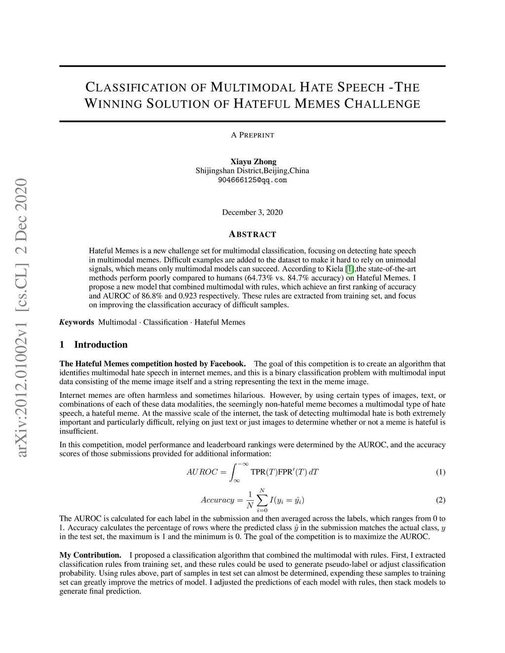 Hateful Memes is a new challenge set for multimodal classification, focusing on detecting hate speech in multimodal memes. Difficult examples are added to the dataset to make it hard to rely on unimodal signals, which means only multimodal models can succeed. According to Kiela,the state-of-the-art methods perform poorly compared to humans (64.73% vs. 84.7% accuracy) on Hateful Memes. I propose a new model that combined multimodal with rules, which achieve the first ranking of accuracy and AUROC of 86.8% and 0.923 respectively. These rules are extracted from training set, and focus on improving the classification accuracy of difficult samples.
