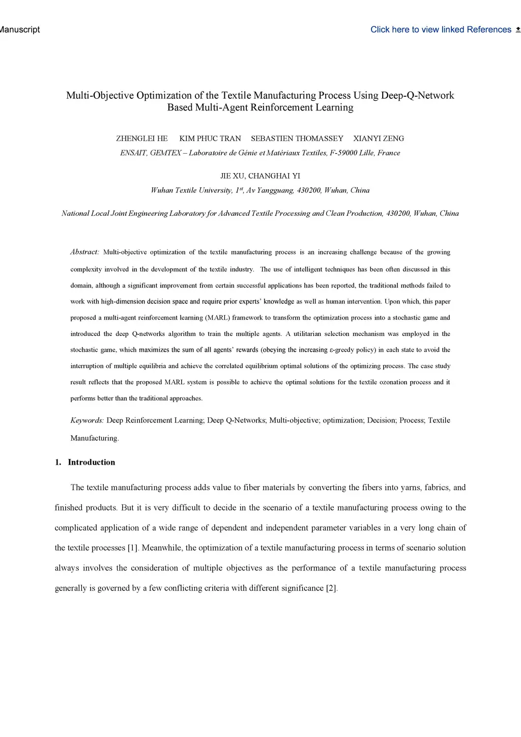 Multi-objective optimization of the textile manufacturing process is an increasing challenge because of the growing complexity involved in the development of the textile industry. The use of intelligent techniques has been often discussed in this domain, although a significant improvement from certain successful applications has been reported, the traditional methods failed to work with high-as well as human intervention. Upon which, this paper proposed a multi-agent reinforcement learning (MARL) framework to transform the optimization process into a stochastic game and introduced the deep Q-networks algorithm to train the multiple agents. A utilitarian selection mechanism was employed in the stochastic game, which (-greedy policy) in each state to avoid the interruption of multiple equilibria and achieve the correlated equilibrium optimal solutions of the optimizing process. The case study result reflects that the proposed MARL system is possible to achieve the optimal solutions for the textile ozonation process and it performs better than the traditional approaches.