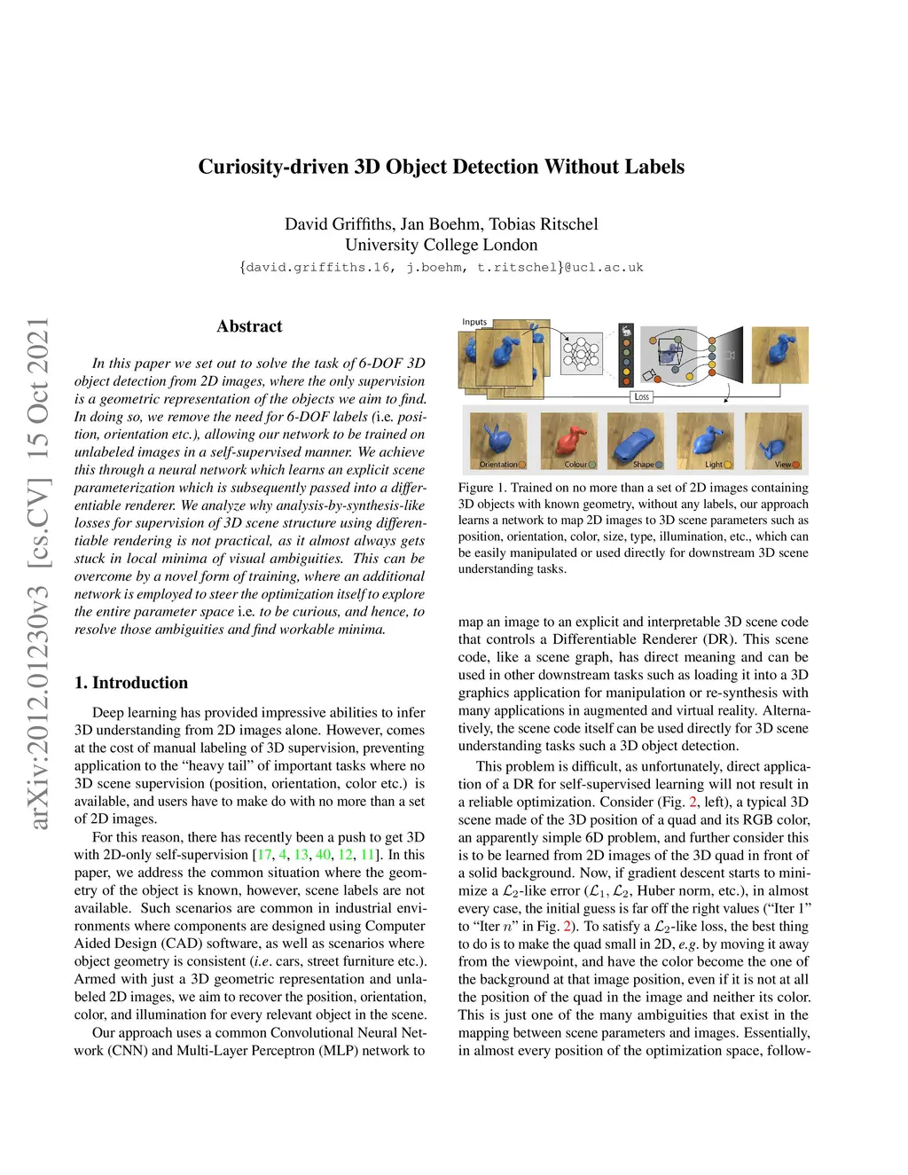 In this paper we set out to solve the task of 6-DOF 3D object detection from 2D images, where the only supervision is a geometric representation of the objects we aim to find. In doing so, we remove the need for 6-DOF labels (i.e., position, orientation etc.), allowing our network to be trained on unlabeled images in a self-supervised manner. We achieve this through a neural network which learns an explicit scene parameterization which is subsequently passed into a differentiable renderer. We analyze why analysis-by-synthesis-like losses for supervision of 3D scene structure using differentiable rendering is not practical, as it almost always gets stuck in local minima of visual ambiguities. This can be overcome by a novel form of training, where an additional network is employed to steer the optimization itself to explore the entire parameter space i.e., to be curious, and hence, to resolve those ambiguities and find workable minima.