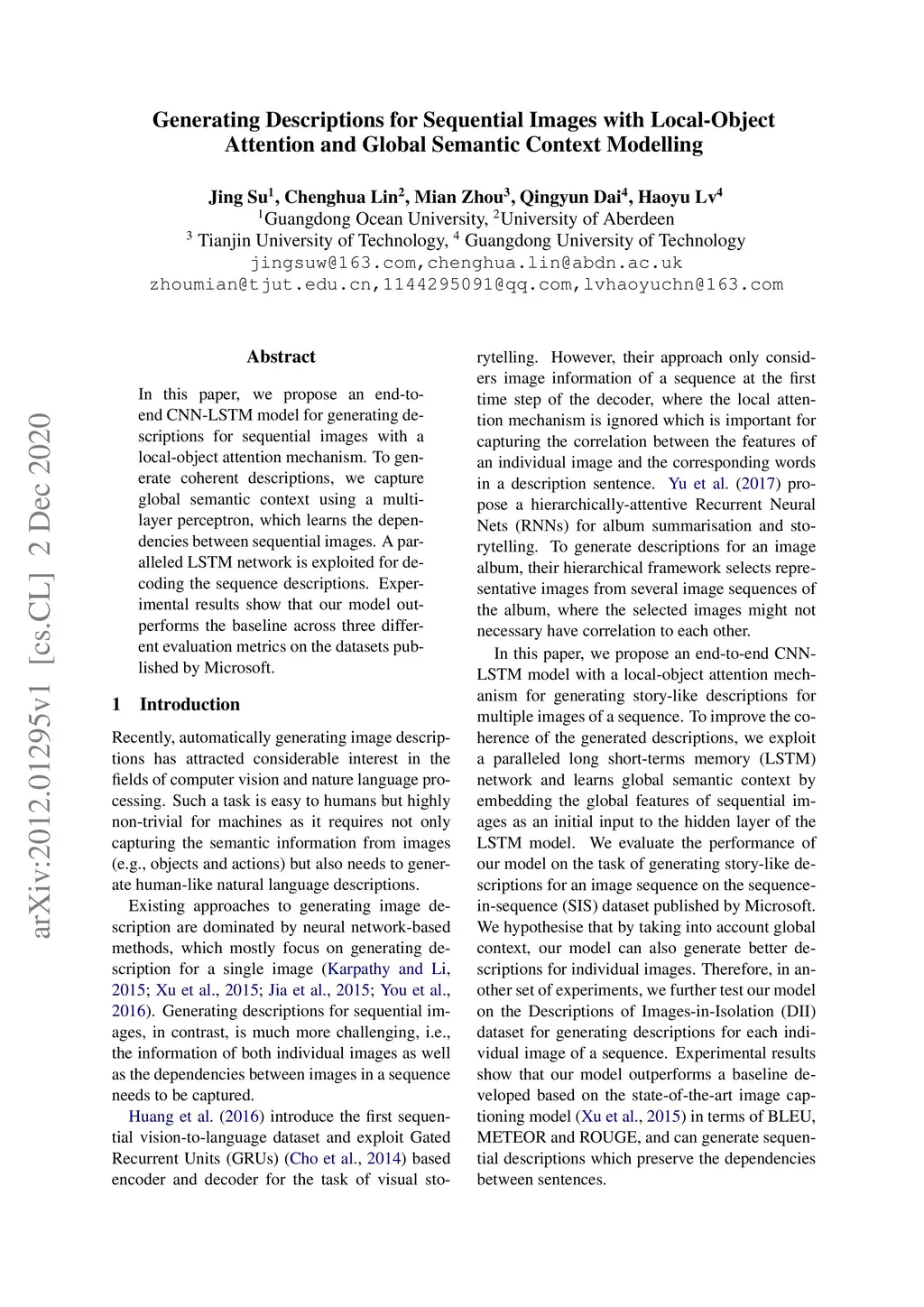 In this paper, we propose an end-to-end CNN-LSTM model for generating descriptions for sequential images with a local-object attention mechanism. To generate coherent descriptions, we capture global semantic context using a multi-layer perceptron, which learns the dependencies between sequential images. A paralleled LSTM network is exploited for decoding the sequence descriptions. Experimental results show that our model outperforms the baseline across three different evaluation metrics on the datasets published by Microsoft.
