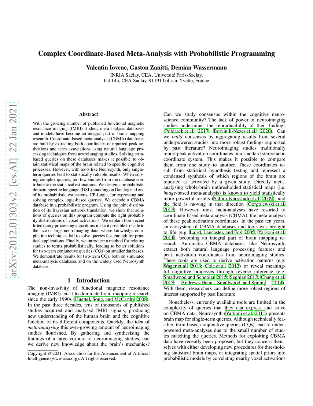 With the growing number of published functional magnetic resonance imaging (fMRI) studies, meta-analysis databases and models have become an integral part of brain mapping research. Coordinate-based meta-analysis (CBMA) databases are built by automatically extracting both coordinates of reported peak activations and term associations using natural language processing (NLP) techniques. Solving term-based queries on these databases make it possible to obtain statistical maps of the brain related to specific cognitive processes. However, with tools like Neurosynth, only singleterm queries lead to statistically reliable results. When solving richer queries, too few studies from the database contribute to the statistical estimations. We design a probabilistic domain-specific language (DSL) standing on Datalog and one of its probabilistic extensions, CP-Logic, for expressing and solving rich logic-based queries. We encode a CBMA database into a probabilistic program. Using the joint distribution of its Bayesian network translation, we show that solutions of queries on this program compute the right probability distributions of voxel activations. We explain how recent lifted query processing algorithms make it possible to scale to the size of large neuroimaging data, where state of the art knowledge compilation (KC) techniques fail to solve queries fast enough for practical applications. Finally, we introduce a method for relating studies to terms probabilistically, leading to better solutions for conjunctive queries on smaller databases. We demonstrate results for two-term conjunctive queries, both on simulated meta-analysis databases and on the widely-used Neurosynth database.