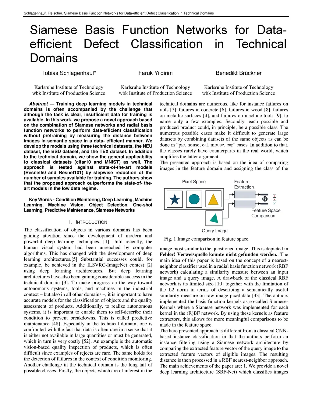 Training deep learning models in technical domains is often accompanied by the challenge that although the task is clear, insufficient data for training is available. In this work, we propose a novel approach based on the combination of Siamese networks and radial basis function networks to perform data-efficient classification without pretraining by measuring the distance between images in semantic space in a data-efficient manner. We develop the models using three technical datasets, the NEU dataset, the BSD dataset, and the TEX dataset. In addition to the technical domain, we show the general applicability to classical datasets (cifar10 and MNIST) as well. The approach is tested against state-of-the-art models (Resnet50 and Resnet101) by stepwise reduction of the number of samples available for training. The authors show that the proposed approach outperforms the state-of-the-art models in the low data regime.