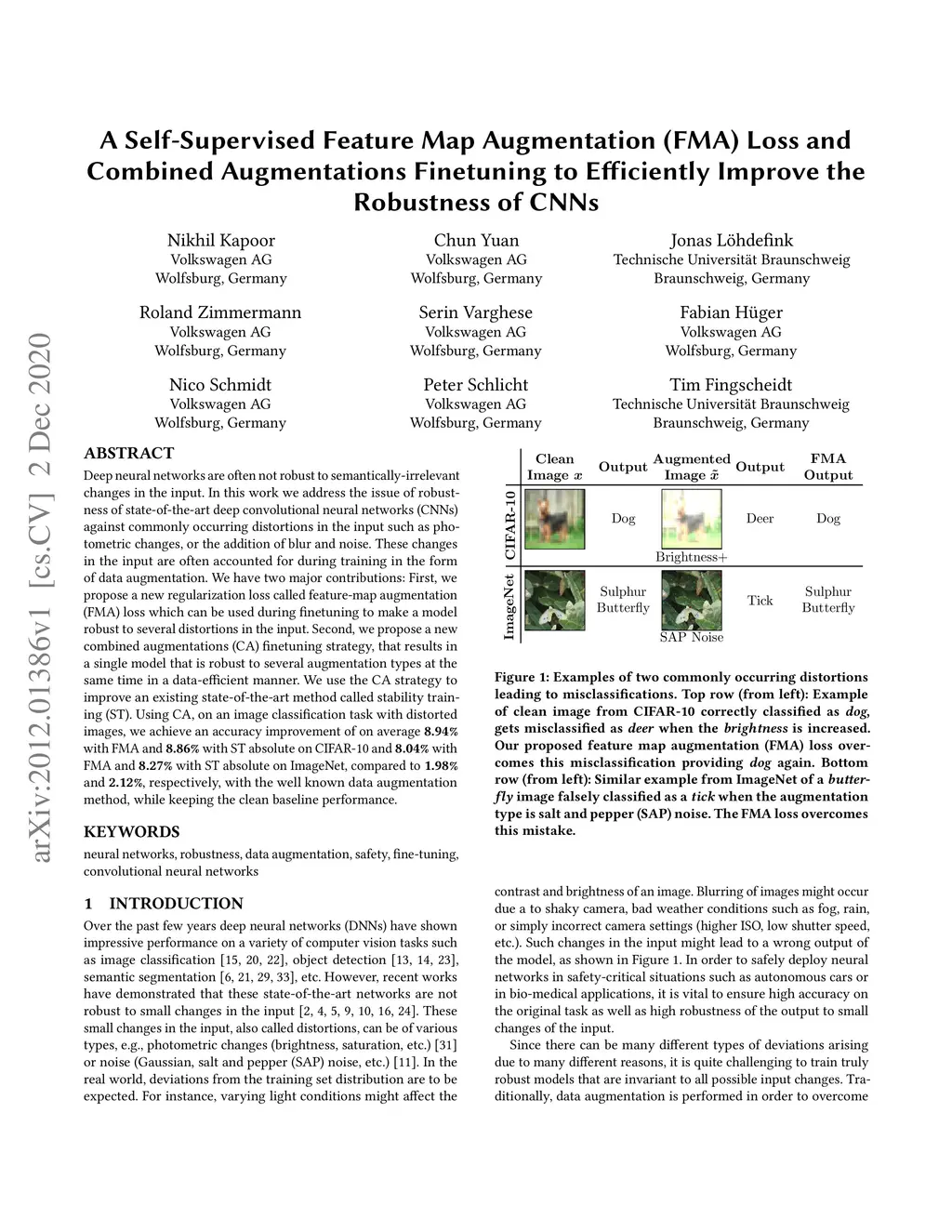 Deep neural networks are often not robust to semantically-irrelevant changes in the input. In this work we address the issue of robustness of state-of-the-art deep convolutional neural networks (CNNs) against commonly occurring distortions in the input such as photometric changes, or the addition of blur and noise. These changes in the input are often accounted for during training in the form of data augmentation. We have two major contributions: First, we propose a new regularization loss called feature-map augmentation (FMA) loss which can be used during finetuning to make a model robust to several distortions in the input. Second, we propose a new combined augmentations (CA) finetuning strategy, that results in a single model that is robust to several augmentation types at the same time in a data-efficient manner. We use the CA strategy to improve an existing state-of-the-art method called stability training (ST). Using CA, on an image classification task with distorted images, we achieve an accuracy improvement of on average 8.94% with FMA and 8.86% with ST absolute on CIFAR-10 and 8.04% with FMA and 8.27% with ST absolute on ImageNet, compared to 1.98% and 2.12%, respectively, with the well known data augmentation method, while keeping the clean baseline performance.