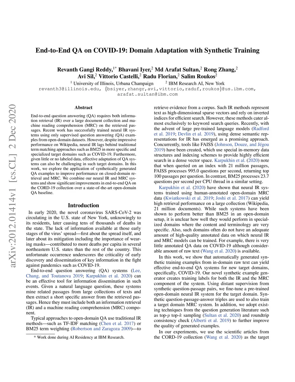 End-to-End QA on COVID-19: Domain Adaptation with Synthetic Training