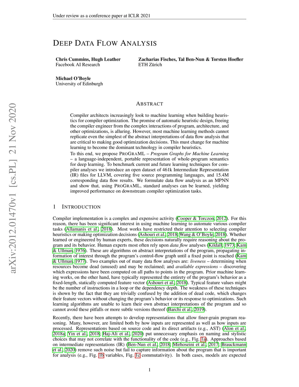 Compiler architects increasingly look to machine learning when building heuristics for compiler optimization. The promise of automatic heuristic design, freeing the compiler engineer from the complex interactions of program, architecture, and other optimizations, is alluring. However, most machine learning methods cannot replicate even the simplest of the abstract interpretations of data flow analysis that are critical to making good optimization decisions. This must change for machine learning to become the dominant technology in compiler heuristics. To this end, we propose ProGraML - Program Graphs for Machine Learning - a language-independent, portable representation of whole-program semantics for deep learning. To benchmark current and future learning techniques for compiler analyses we introduce an open dataset of 461k Intermediate Representation (IR) files for LLVM, covering five source programming languages, and 15.4M corresponding data flow results. We formulate data flow analysis as an MPNN and show that, using ProGraML, standard analyses can be learned, yielding improved performance on downstream compiler optimization tasks.
