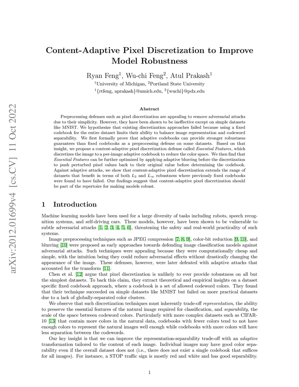 Preprocessing defenses such as pixel discretization are appealing to remove adversarial attacks due to their simplicity. However, they have been shown to be ineffective except on simple datasets like MNIST. We hypothesize that existing discretization approaches failed because using a fixed codebook for the entire dataset limits their ability to balance image representation and codeword separability. We first formally prove that adaptive codebooks can provide stronger robustness guarantees than fixed codebooks as a preprocessing defense on some datasets. Based on that insight, we propose a content-adaptive pixel discretization defense called Essential Features, which discretizes the image to a per-image adaptive codebook to reduce the color space. We then find that Essential Features can be further optimized by applying adaptive blurring before the discretization to push perturbed pixel values back to their original value before determining the codebook. Against adaptive attacks, we show that content-adaptive pixel discretization extends the range of datasets that benefit in terms of both L_2 and L_infinity robustness where previously fixed codebooks were found to have failed. Our findings suggest that content-adaptive pixel discretization should be part of the repertoire for making models robust.