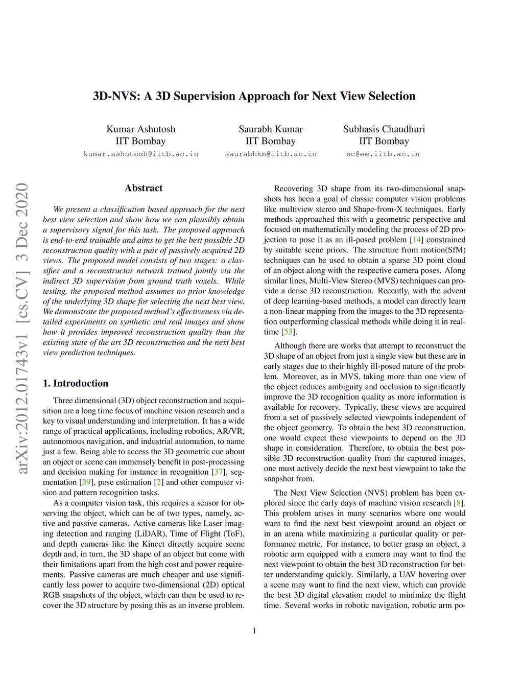 We present a classification based approach for the next best view selection and show how we can plausibly obtain a supervisory signal for this task. The proposed approach is end-to-end trainable and aims to get the best possible 3D reconstruction quality with a pair of passively acquired 2D views. The proposed model consists of two stages: a classifier and a reconstructor network trained jointly via the indirect 3D supervision from ground truth voxels. While testing, the proposed method assumes no prior knowledge of the underlying 3D shape for selecting the next best view. We demonstrate the proposed method's effectiveness via detailed experiments on synthetic and real images and show how it provides improved reconstruction quality than the existing state of the art 3D reconstruction and the next best view prediction techniques.