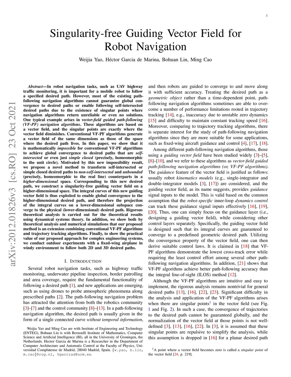 Most of the existing path-following navigation algorithms cannot guarantee global convergence to desired paths or enable following self-intersected desired paths due to the existence of singular points where navigation algorithms return unreliable or even no solutions. One typical example arises in vector-field guided path-following (VF-PF) navigation algorithms. These algorithms are based on a vector field, and the singular points are exactly where the vector field diminishes. In this paper, we show that it is mathematically impossible for conventional VF-PF algorithms to achieve global convergence to desired paths that are self-intersected or even just simple closed (precisely, homeomorphic to the unit circle). Motivated by this new impossibility result, we propose a novel method to transform self-intersected or simple closed desired paths to non-self-intersected and unbounded (precisely, homeomorphic to the real line) counterparts in a higher-dimensional space. Corresponding to this new desired path, we construct a singularity-free guiding vector field on a higher-dimensional space. The integral curves of this new guiding vector field is thus exploited to enable global convergence to the higher-dimensional desired path, and therefore the projection of the integral curves on a lower-dimensional subspace converge to the physical (lower-dimensional) desired path. Rigorous theoretical analysis is carried out for the theoretical results using dynamical systems theory. In addition, we show both by theoretical analysis and numerical simulations that our proposed method is an extension combining conventional VF-PF algorithms and trajectory tracking algorithms. Finally, to show the practical value of our proposed approach for complex engineering systems, we conduct outdoor experiments with a fixed-wing airplane in windy environment to follow both 2D and 3D desired paths.