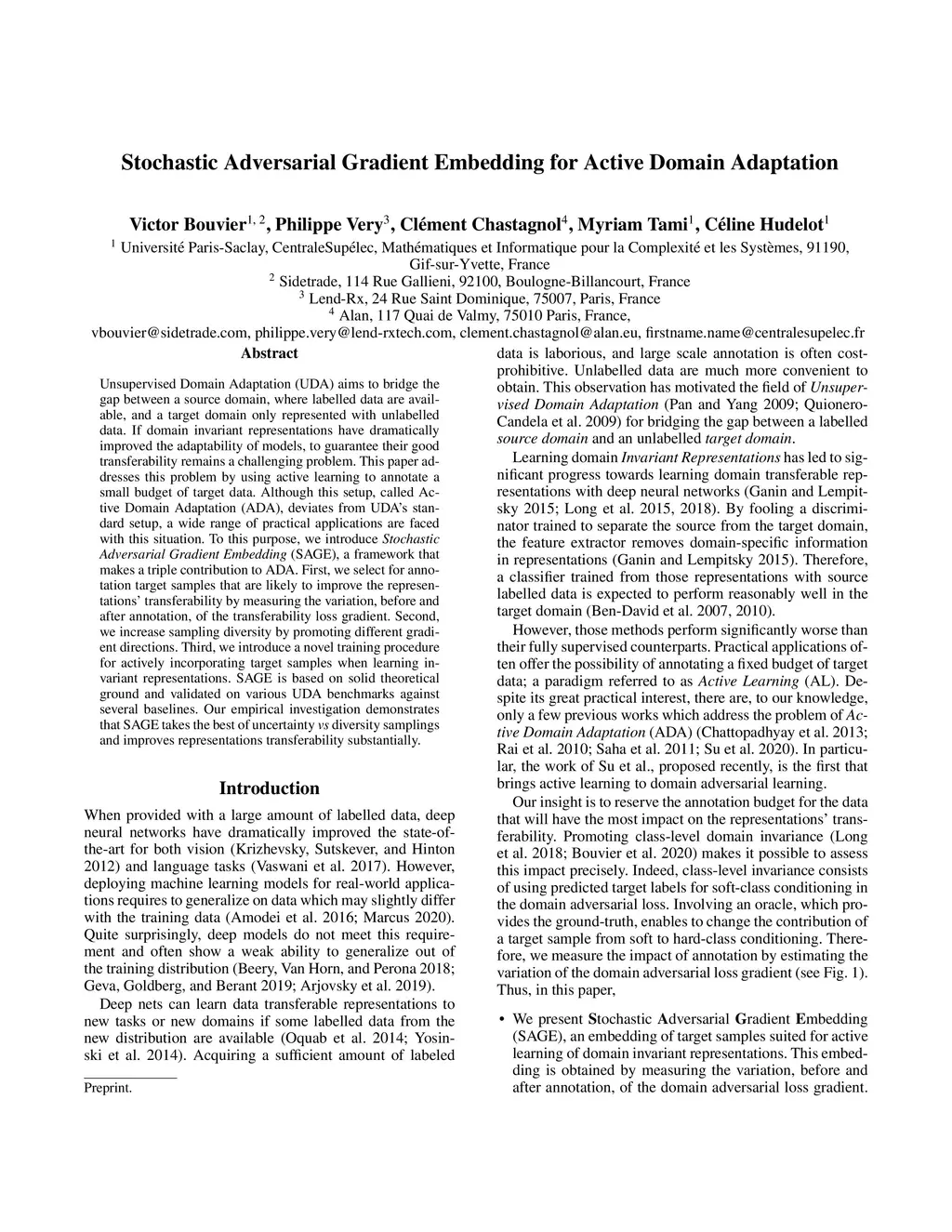 Unsupervised Domain Adaptation (UDA) aims to bridge the gap between a source domain, where labelled data are available, and a target domain only represented with unlabelled data. If domain invariant representations have dramatically improved the adaptability of models, to guarantee their good transferability remains a challenging problem. This paper addresses this problem by using active learning to annotate a small budget of target data. Although this setup, called Active Domain Adaptation (ADA), deviates from UDA's standard setup, a wide range of practical applications are faced with this situation. To this purpose, we introduce \textit{Stochastic Adversarial Gradient Embedding} (SAGE), a framework that makes a triple contribution to ADA. First, we select for annotation target samples that are likely to improve the representations' transferability by measuring the variation, before and after annotation, of the transferability loss gradient. Second, we increase sampling diversity by promoting different gradient directions. Third, we introduce a novel training procedure for actively incorporating target samples when learning invariant representations. SAGE is based on solid theoretical ground and validated on various UDA benchmarks against several baselines. Our empirical investigation demonstrates that SAGE takes the best of uncertainty \textit{vs} diversity samplings and improves representations transferability substantially.