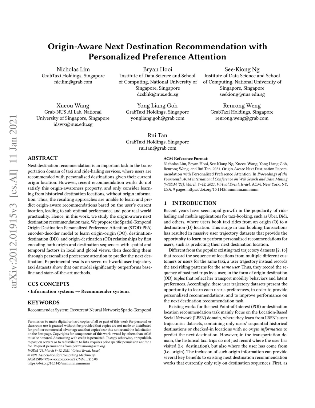 Next destination recommendation is an important task in the transportation domain of taxi and ride-hailing services, where users are recommended with personalized destinations given their current origin location. However, recent recommendation works do not satisfy this origin-awareness property, and only consider learning from historical destination locations, without origin information. Thus, the resulting approaches are unable to learn and predict origin-aware recommendations based on the user's current location, leading to sub-optimal performance and poor real-world practicality. Hence, in this work, we study the origin-aware next destination recommendation task. We propose the Spatial-Temporal Origin-Destination Personalized Preference Attention (STOD-PPA) encoder-decoder model to learn origin-origin (OO), destination-destination (DD), and origin-destination (OD) relationships by first encoding both origin and destination sequences with spatial and temporal factors in local and global views, then decoding them through personalized preference attention to predict the next destination. Experimental results on seven real-world user trajectory taxi datasets show that our model significantly outperforms baseline and state-of-the-art methods.