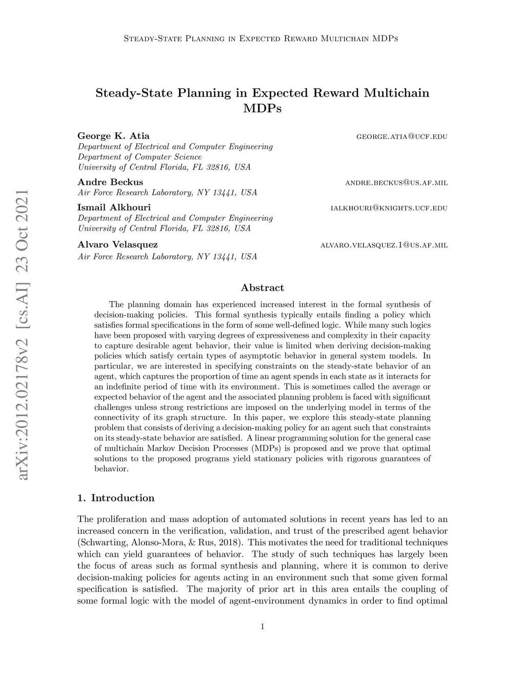 The planning domain has experienced increased interest in the formal synthesis of decision-making policies. This formal synthesis typically entails finding a policy which satisfies formal specifications in the form of some well-defined logic. While many such logics have been proposed with varying degrees of expressiveness and complexity in their capacity to capture desirable agent behavior, their value is limited when deriving decision-making policies which satisfy certain types of asymptotic behavior in general system models. In particular, we are interested in specifying constraints on the steady-state behavior of an agent, which captures the proportion of time an agent spends in each state as it interacts for an indefinite period of time with its environment. This is sometimes called the average or expected behavior of the agent and the associated planning problem is faced with significant challenges unless strong restrictions are imposed on the underlying model in terms of the connectivity of its graph structure. In this paper, we explore this steady-state planning problem that consists of deriving a decision-making policy for an agent such that constraints on its steady-state behavior are satisfied. A linear programming solution for the general case of multichain Markov Decision Processes (MDPs) is proposed and we prove that optimal solutions to the proposed programs yield stationary policies with rigorous guarantees of behavior.