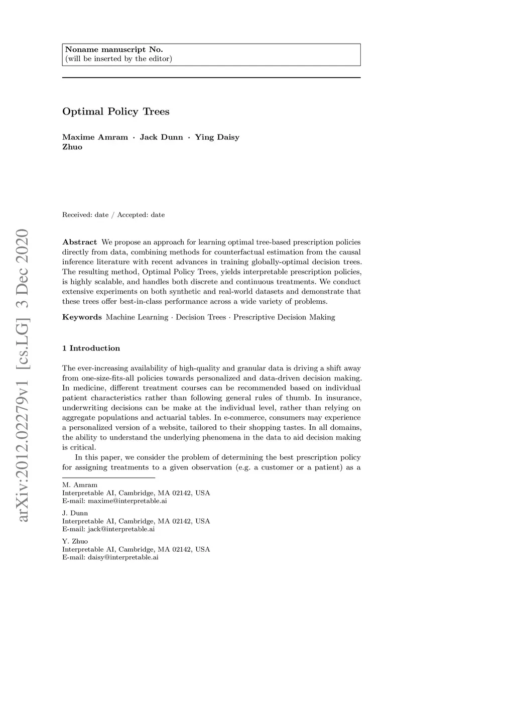 We propose an approach for learning optimal tree-based prescription policies directly from data, combining methods for counterfactual estimation from the causal inference literature with recent advances in training globally-optimal decision trees. The resulting method, Optimal Policy Trees, yields interpretable prescription policies, is highly scalable, and handles both discrete and continuous treatments. We conduct extensive experiments on both synthetic and real-world datasets and demonstrate that these trees offer best-in-class performance across a wide variety of problems.