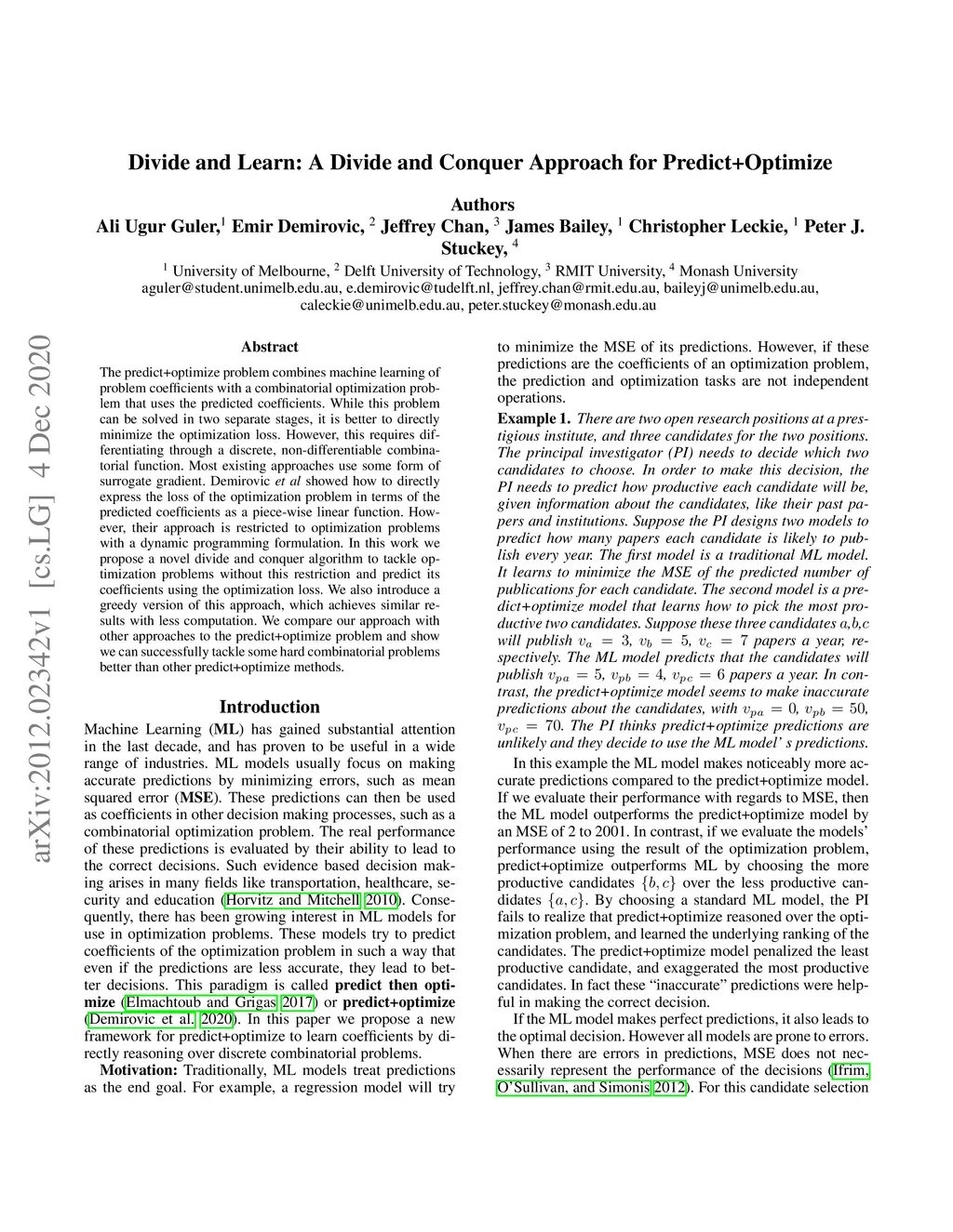 The predict+optimize problem combines machine learning ofproblem coefficients with a combinatorial optimization prob-lem that uses the predicted coefficients. While this problemcan be solved in two separate stages, it is better to directlyminimize the optimization loss. However, this requires dif-ferentiating through a discrete, non-differentiable combina-torial function. Most existing approaches use some form ofsurrogate gradient. Demirovicet alshowed how to directlyexpress the loss of the optimization problem in terms of thepredicted coefficients as a piece-wise linear function. How-ever, their approach is restricted to optimization problemswith a dynamic programming formulation. In this work wepropose a novel divide and conquer algorithm to tackle op-timization problems without this restriction and predict itscoefficients using the optimization loss. We also introduce agreedy version of this approach, which achieves similar re-sults with less computation. We compare our approach withother approaches to the predict+optimize problem and showwe can successfully tackle some hard combinatorial problemsbetter than other predict+optimize methods.
