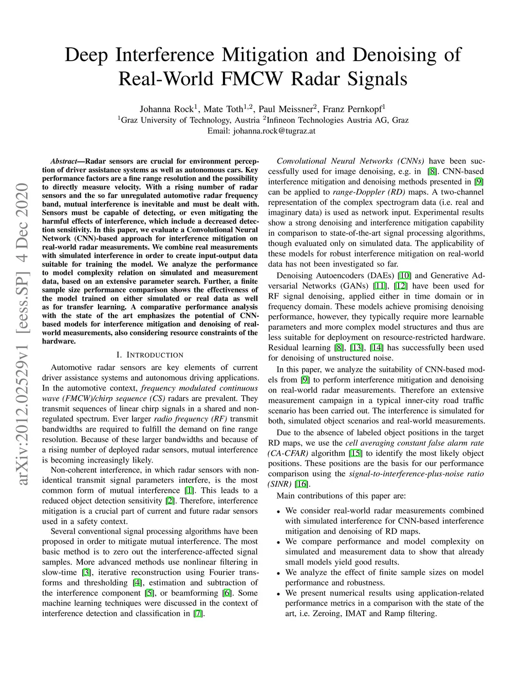 Radar sensors are crucial for environment perception of driver assistance systems as well as autonomous cars. Key performance factors are a fine range resolution and the possibility to directly measure velocity. With a rising number of radar sensors and the so far unregulated automotive radar frequency band, mutual interference is inevitable and must be dealt with. Sensors must be capable of detecting, or even mitigating the harmful effects of interference, which include a decreased detection sensitivity. In this paper, we evaluate a Convolutional Neural Network (CNN)-based approach for interference mitigation on real-world radar measurements. We combine real measurements with simulated interference in order to create input-output data suitable for training the model. We analyze the performance to model complexity relation on simulated and measurement data, based on an extensive parameter search. Further, a finite sample size performance comparison shows the effectiveness of the model trained on either simulated or real data as well as for transfer learning. A comparative performance analysis with the state of the art emphasizes the potential of CNN-based models for interference mitigation and denoising of real-world measurements, also considering resource constraints of the hardware.