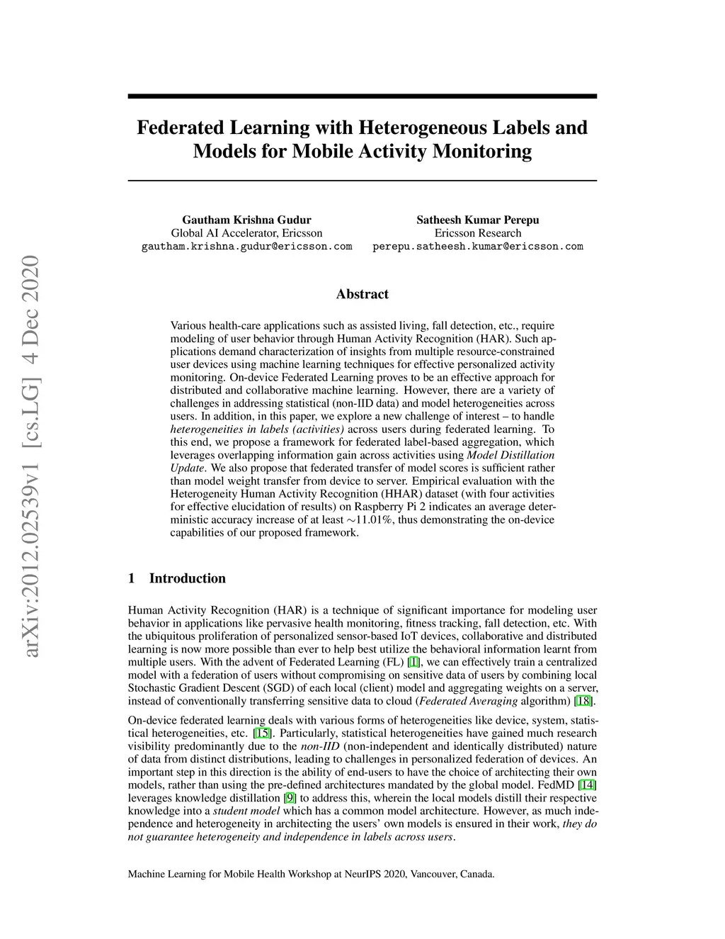 Various health-care applications such as assisted living, fall detection, etc., require modeling of user behavior through Human Activity Recognition (HAR). Such applications demand characterization of insights from multiple resource-constrained user devices using machine learning techniques for effective personalized activity monitoring. On-device Federated Learning proves to be an effective approach for distributed and collaborative machine learning. However, there are a variety of challenges in addressing statistical (non-IID data) and model heterogeneities across users. In addition, in this paper, we explore a new challenge of interest -- to handle heterogeneities in labels (activities) across users during federated learning. To this end, we propose a framework for federated label-based aggregation, which leverages overlapping information gain across activities using Model Distillation Update. We also propose that federated transfer of model scores is sufficient rather than model weight transfer from device to server. Empirical evaluation with the Heterogeneity Human Activity Recognition (HHAR) dataset (with four activities for effective elucidation of results) on Raspberry Pi 2 indicates an average deterministic accuracy increase of at least ~11.01%, thus demonstrating the on-device capabilities of our proposed framework.