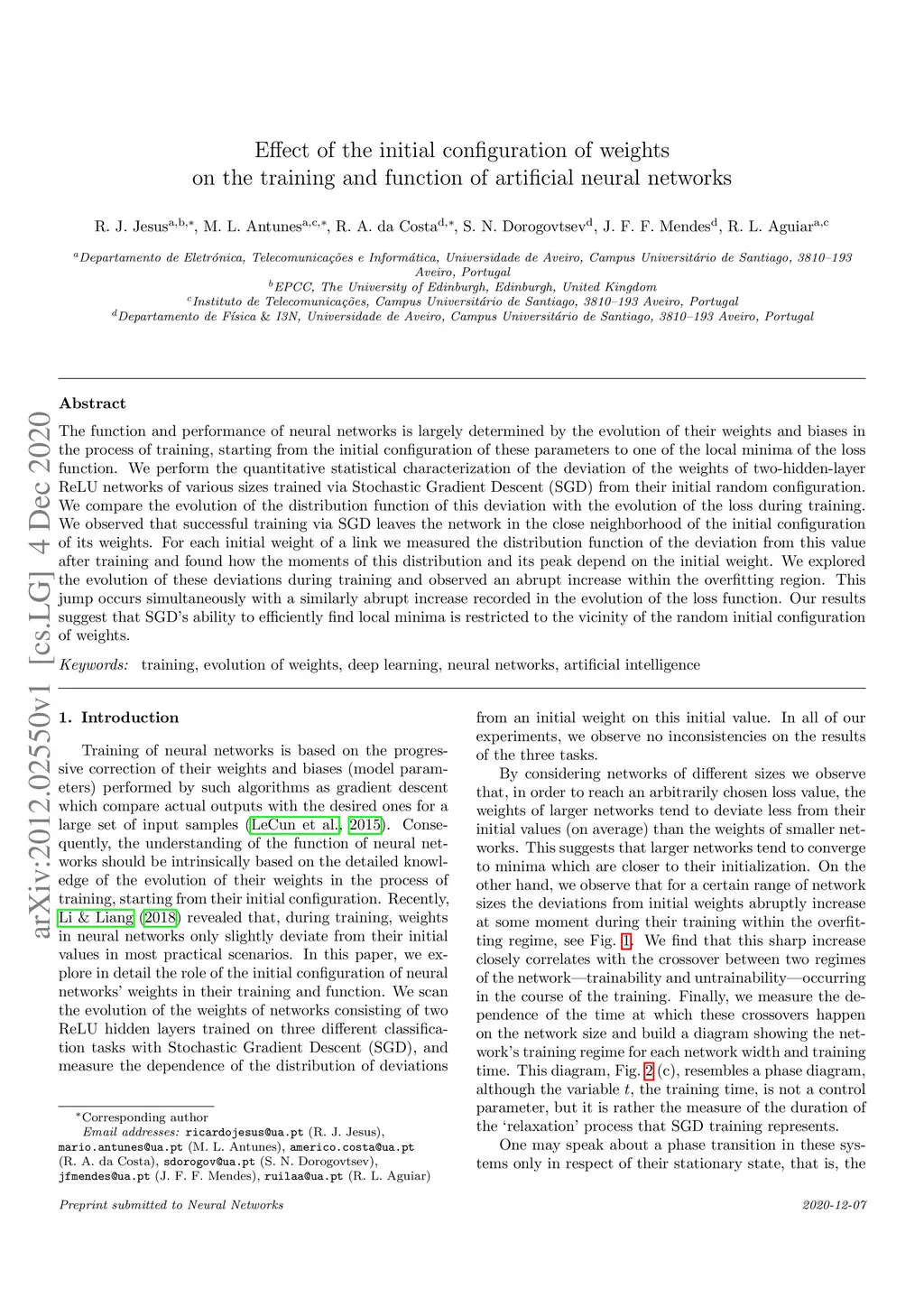 Effect of the initial configuration of weights on the training and