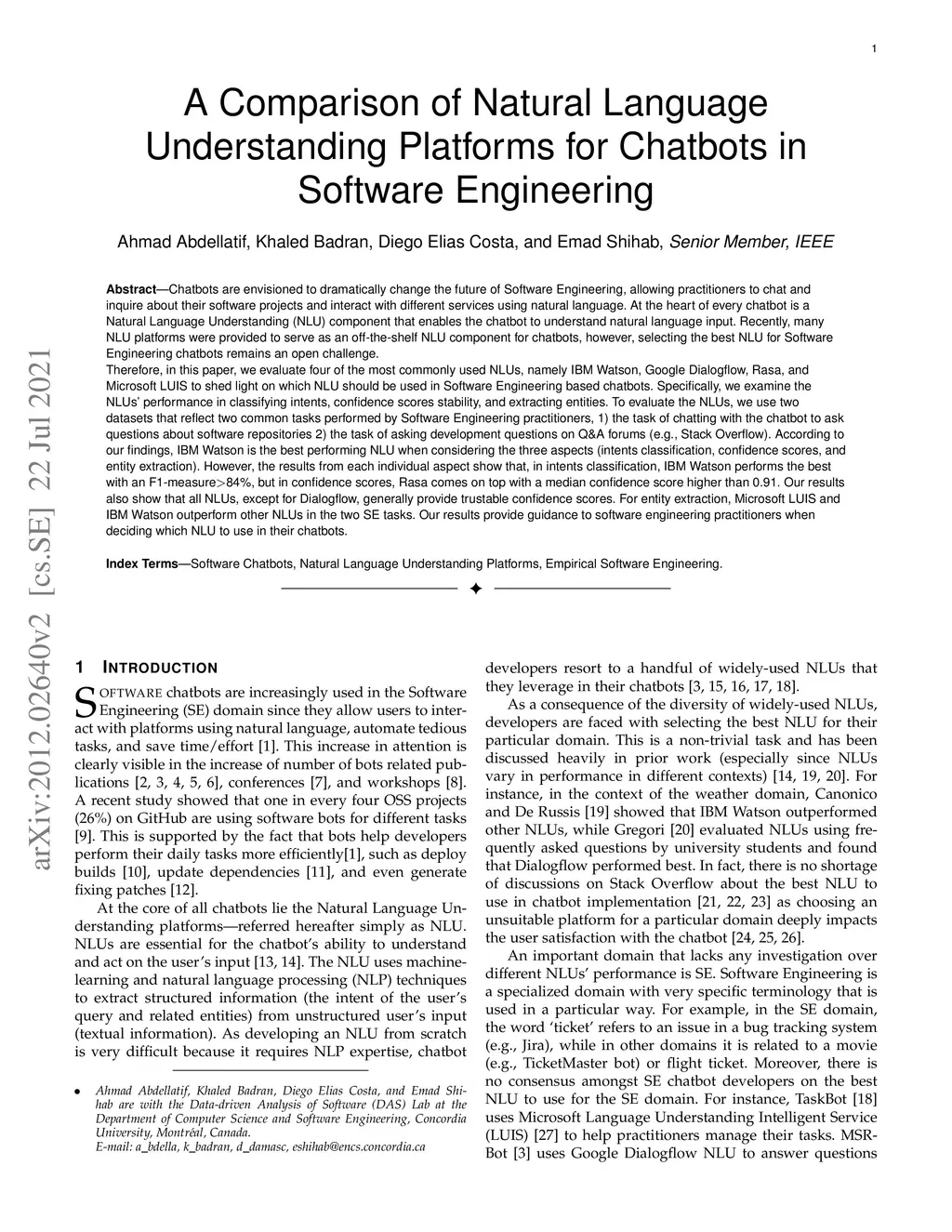 Chatbots are envisioned to dramatically change the future of Software Engineering, allowing practitioners to chat and inquire about their software projects and interact with different services using natural language. At the heart of every chatbot is a Natural Language Understanding (NLU) component that enables the chatbot to understand natural language input. Recently, many NLU platforms were provided to serve as an off-the-shelf NLU component for chatbots, however, selecting the best NLU for Software Engineering chatbots remains an open challenge. Therefore, in this paper, we evaluate four of the most commonly used NLUs, namely IBM Watson, Google Dialogflow, Rasa, and Microsoft LUIS to shed light on which NLU should be used in Software Engineering based chatbots. Specifically, we examine the NLUs' performance in classifying intents, confidence scores stability, and extracting entities. To evaluate the NLUs, we use two datasets that reflect two common tasks performed by Software Engineering practitioners, 1) the task of chatting with the chatbot to ask questions about software repositories 2) the task of asking development questions on Q&A forums (e.g., Stack Overflow). According to our findings, IBM Watson is the best performing NLU when considering the three aspects (intents classification, confidence scores, and entity extraction). However, the results from each individual aspect show that, in intents classification, IBM Watson performs the best with an F1-measure > 84%, but in confidence scores, Rasa comes on top with a median confidence score higher than 0.91. Our results also show that all NLUs, except for Dialogflow, generally provide trustable confidence scores. For entity extraction, Microsoft LUIS and IBM Watson outperform other NLUs in the two SE tasks. Our results provide guidance to software engineering practitioners when deciding which NLU to use in their chatbots.