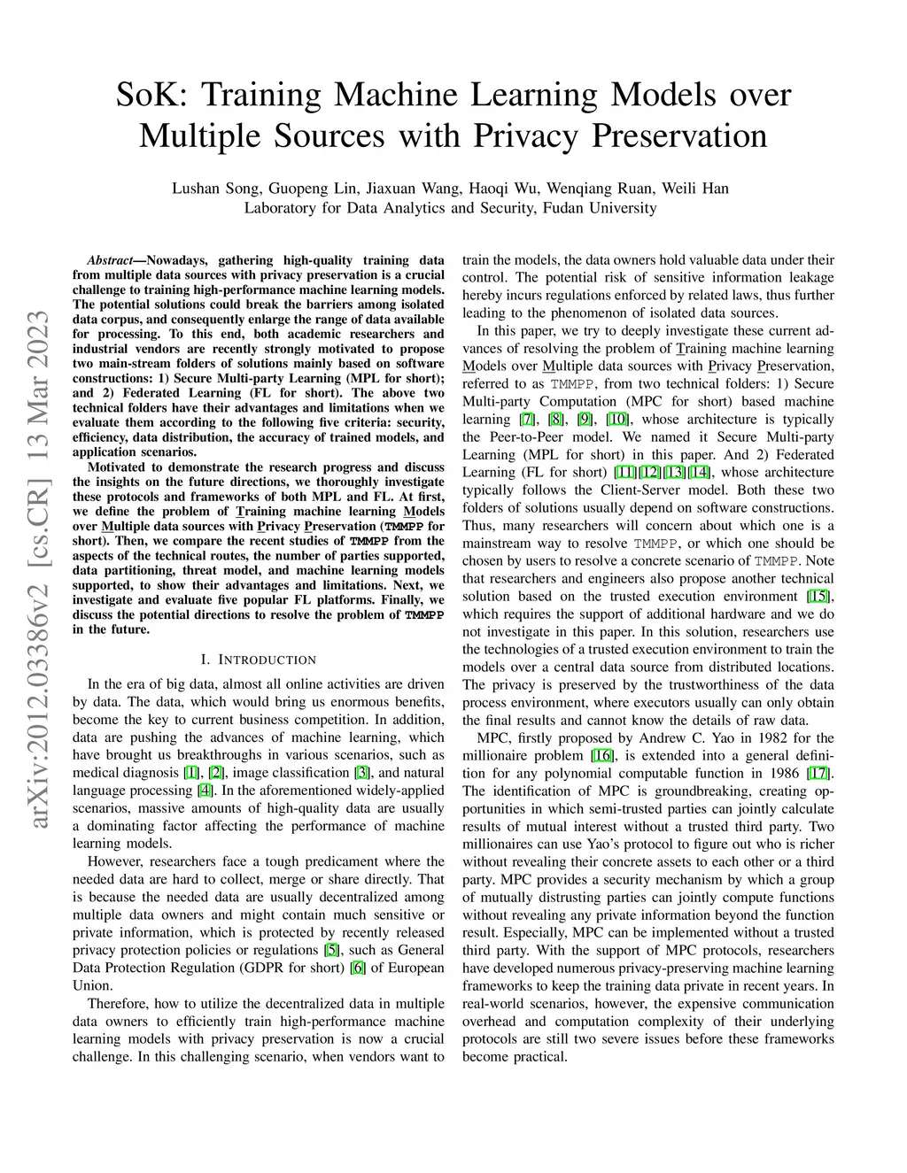 Nowadays, gathering high-quality training data from multiple data sources with privacy preservation is a crucial challenge to training high-performance machine learning models. The potential solutions could break the barriers among isolated data corpus, and consequently enlarge the range of data available for processing. To this end, both academic researchers and industrial vendors are recently strongly motivated to propose two main-stream folders of solutions mainly based on software constructions: 1) Secure Multi-party Learning (MPL for short); and 2) Federated Learning (FL for short). The above two technical folders have their advantages and limitations when we evaluate them according to the following five criteria: security, efficiency, data distribution, the accuracy of trained models, and application scenarios. Motivated to demonstrate the research progress and discuss the insights on the future directions, we thoroughly investigate these protocols and frameworks of both MPL and FL. At first, we define the problem of Training machine learning Models over Multiple data sources with Privacy Preservation (TMMPP for short). Then, we compare the recent studies of TMMPP from the aspects of the technical routes, the number of parties supported, data partitioning, threat model, and machine learning models supported, to show their advantages and limitations. Next, we investigate and evaluate five popular FL platforms. Finally, we discuss the potential directions to resolve the problem of TMMPP in the future.