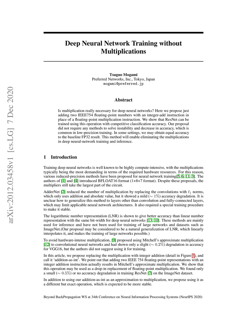 Is multiplication really necessary for deep neural networks? Here we propose just adding two IEEE754 floating-point numbers with an integer-add instruction in place of a floating-point multiplication instruction. We show that ResNet can be trained using this operation with competitive classification accuracy. Our proposal did not require any methods to solve instability and decrease in accuracy, which is common in low-precision training. In some settings, we may obtain equal accuracy to the baseline FP32 result. This method will enable eliminating the multiplications in deep neural-network training and inference.