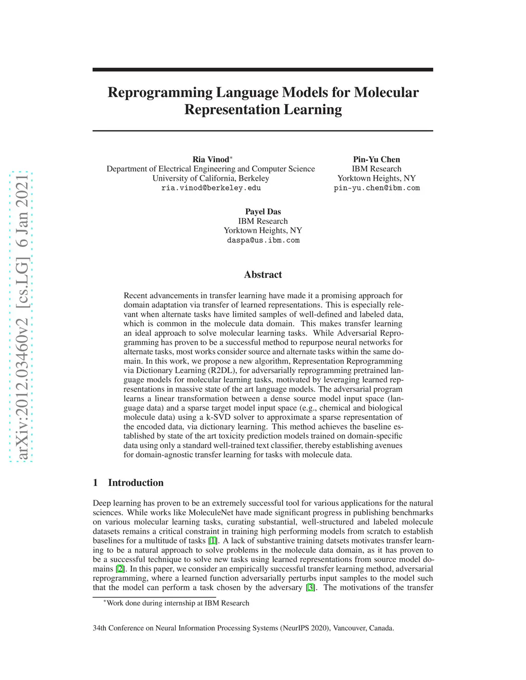 Recent advancements in transfer learning have made it a promising approach for domain adaptation via transfer of learned representations. This is especially when relevant when alternate tasks have limited samples of well-defined and labeled data, which is common in the molecule data domain. This makes transfer learning an ideal approach to solve molecular learning tasks. While Adversarial reprogramming has proven to be a successful method to repurpose neural networks for alternate tasks, most works consider source and alternate tasks within the same domain. In this work, we propose a new algorithm, Representation Reprogramming via Dictionary Learning (R2DL), for adversarially reprogramming pretrained language models for molecular learning tasks, motivated by leveraging learned representations in massive state of the art language models. The adversarial program learns a linear transformation between a dense source model input space (language data) and a sparse target model input space (e.g., chemical and biological molecule data) using a k-SVD solver to approximate a sparse representation of the encoded data, via dictionary learning. R2DL achieves the baseline established by state of the art toxicity prediction models trained on domain-specific data and outperforms the baseline in a limited training-data setting, thereby establishing avenues for domain-agnostic transfer learning for tasks with molecule data.