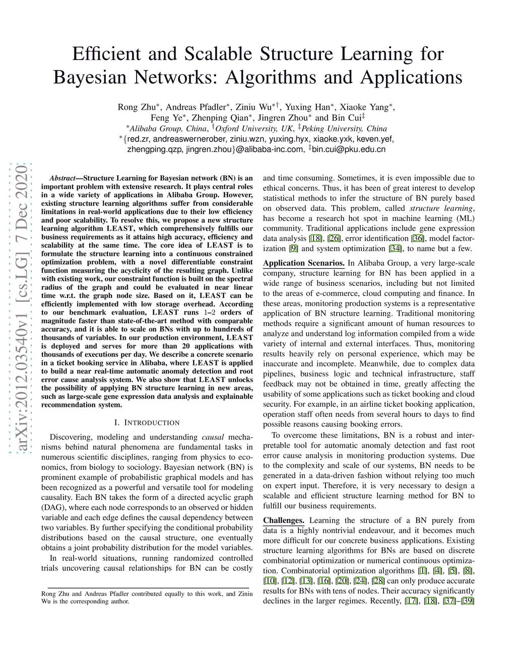 Structure Learning for Bayesian network (BN) is an important problem with extensive research. It plays central roles in a wide variety of applications in Alibaba Group. However, existing structure learning algorithms suffer from considerable limitations in real world applications due to their low efficiency and poor scalability. To resolve this, we propose a new structure learning algorithm LEAST, which comprehensively fulfills our business requirements as it attains high accuracy, efficiency and scalability at the same time. The core idea of LEAST is to formulate the structure learning into a continuous constrained optimization problem, with a novel differentiable constraint function measuring the acyclicity of the resulting graph. Unlike with existing work, our constraint function is built on the spectral radius of the graph and could be evaluated in near linear time w.r.t. the graph node size. Based on it, LEAST can be efficiently implemented with low storage overhead. According to our benchmark evaluation, LEAST runs 1 to 2 orders of magnitude faster than state of the art method with comparable accuracy, and it is able to scale on BNs with up to hundreds of thousands of variables. In our production environment, LEAST is deployed and serves for more than 20 applications with thousands of executions per day. We describe a concrete scenario in a ticket booking service in Alibaba, where LEAST is applied to build a near real-time automatic anomaly detection and root error cause analysis system. We also show that LEAST unlocks the possibility of applying BN structure learning in new areas, such as large-scale gene expression data analysis and explainable recommendation system.