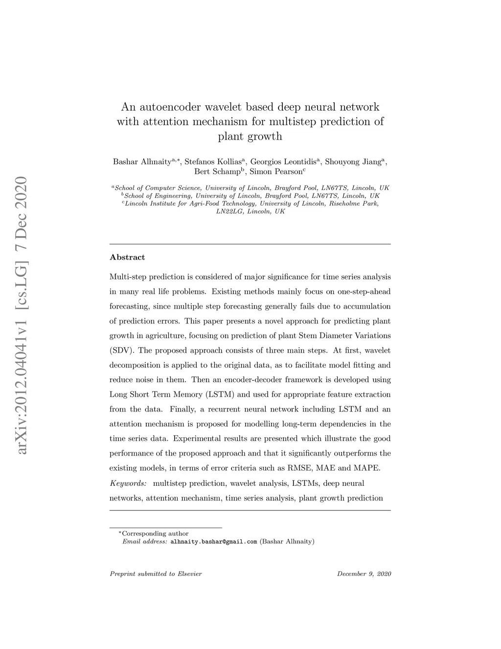 Multi-step prediction is considered of major significance for time series analysis in many real life problems. Existing methods mainly focus on one-step-ahead forecasting, since multiple step forecasting generally fails due to accumulation of prediction errors. This paper presents a novel approach for predicting plant growth in agriculture, focusing on prediction of plant Stem Diameter Variations (SDV). The proposed approach consists of three main steps. At first, wavelet decomposition is applied to the original data, as to facilitate model fitting and reduce noise in them. Then an encoder-decoder framework is developed using Long Short Term Memory (LSTM) and used for appropriate feature extraction from the data. Finally, a recurrent neural network including LSTM and an attention mechanism is proposed for modelling long-term dependencies in the time series data. Experimental results are presented which illustrate the good performance of the proposed approach and that it significantly outperforms the existing models, in terms of error criteria such as RMSE, MAE and MAPE.
