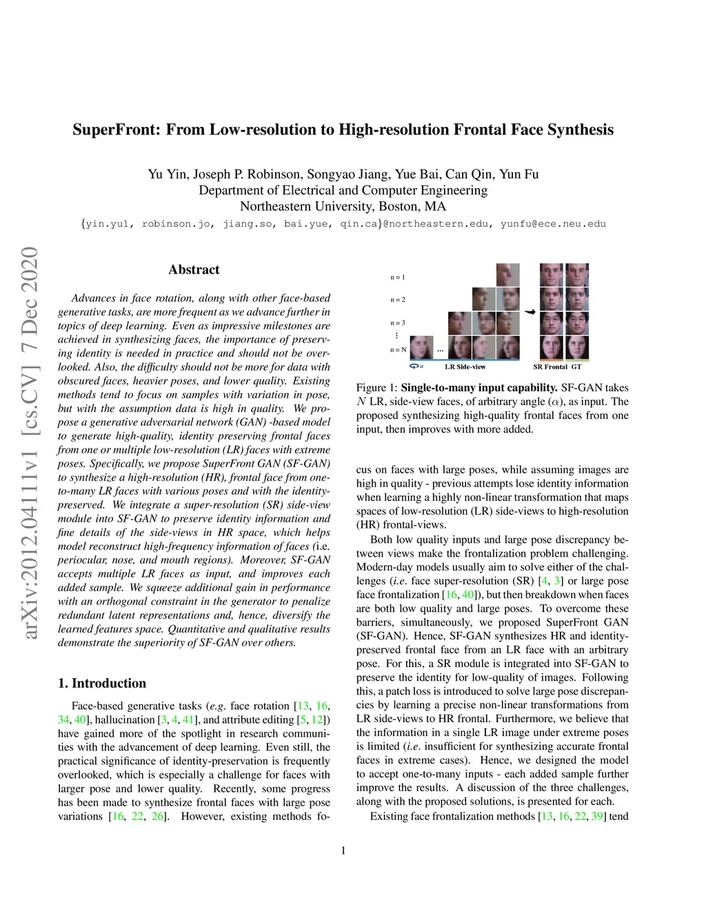 Advances in face rotation, along with other face-based generative tasks, are more frequent as we advance further in topics of deep learning. Even as impressive milestones are achieved in synthesizing faces, the importance of preserving identity is needed in practice and should not be overlooked. Also, the difficulty should not be more for data with obscured faces, heavier poses, and lower quality. Existing methods tend to focus on samples with variation in pose, but with the assumption data is high in quality. We propose a generative adversarial network (GAN) -based model to generate high-quality, identity preserving frontal faces from one or multiple low-resolution (LR) faces with extreme poses. Specifically, we propose SuperFront-GAN (SF-GAN) to synthesize a high-resolution (HR), frontal face from one-to-many LR faces with various poses and with the identity-preserved. We integrate a super-resolution (SR) side-view module into SF-GAN to preserve identity information and fine details of the side-views in HR space, which helps model reconstruct high-frequency information of faces (i.e., periocular, nose, and mouth regions). Moreover, SF-GAN accepts multiple LR faces as input, and improves each added sample. We squeeze additional gain in performance with an orthogonal constraint in the generator to penalize redundant latent representations and, hence, diversify the learned features space. Quantitative and qualitative results demonstrate the superiority of SF-GAN over others.