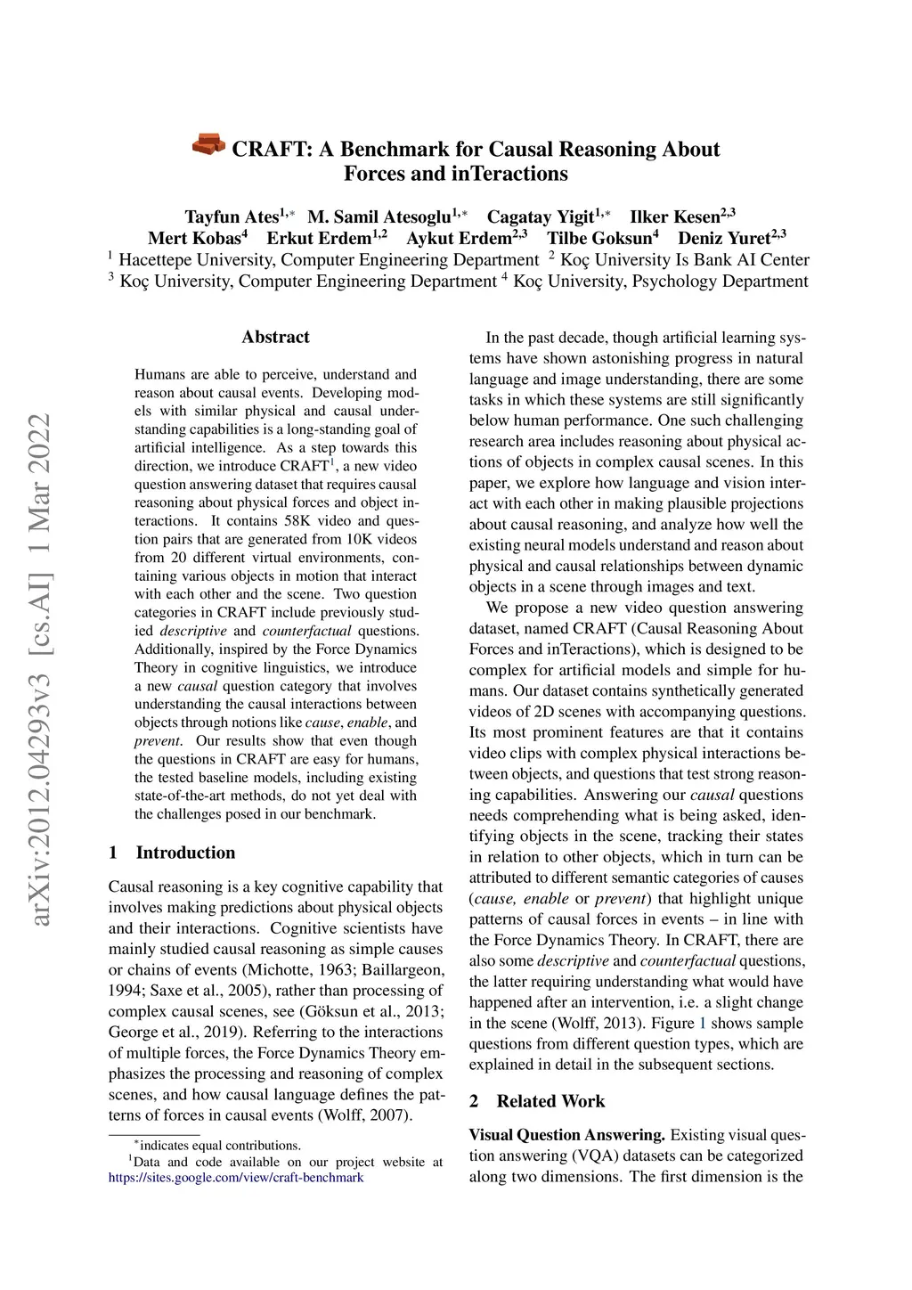 Humans are able to perceive, understand and reason about causal events. Developing models with similar physical and causal understanding capabilities is a long-standing goal of artificial intelligence. As a step towards this direction, we introduce CRAFT, a new video question answering dataset that requires causal reasoning about physical forces and object interactions. It contains 58K video and question pairs that are generated from 10K videos from 20 different virtual environments, containing various objects in motion that interact with each other and the scene. Two question categories in CRAFT include previously studied descriptive and counterfactual questions. Additionally, inspired by the Force Dynamics Theory in cognitive linguistics, we introduce a new causal question category that involves understanding the causal interactions between objects through notions like cause, enable, and prevent. Our results show that even though the questions in CRAFT are easy for humans, the tested baseline models, including existing state-of-the-art methods, do not yet deal with the challenges posed in our benchmark.