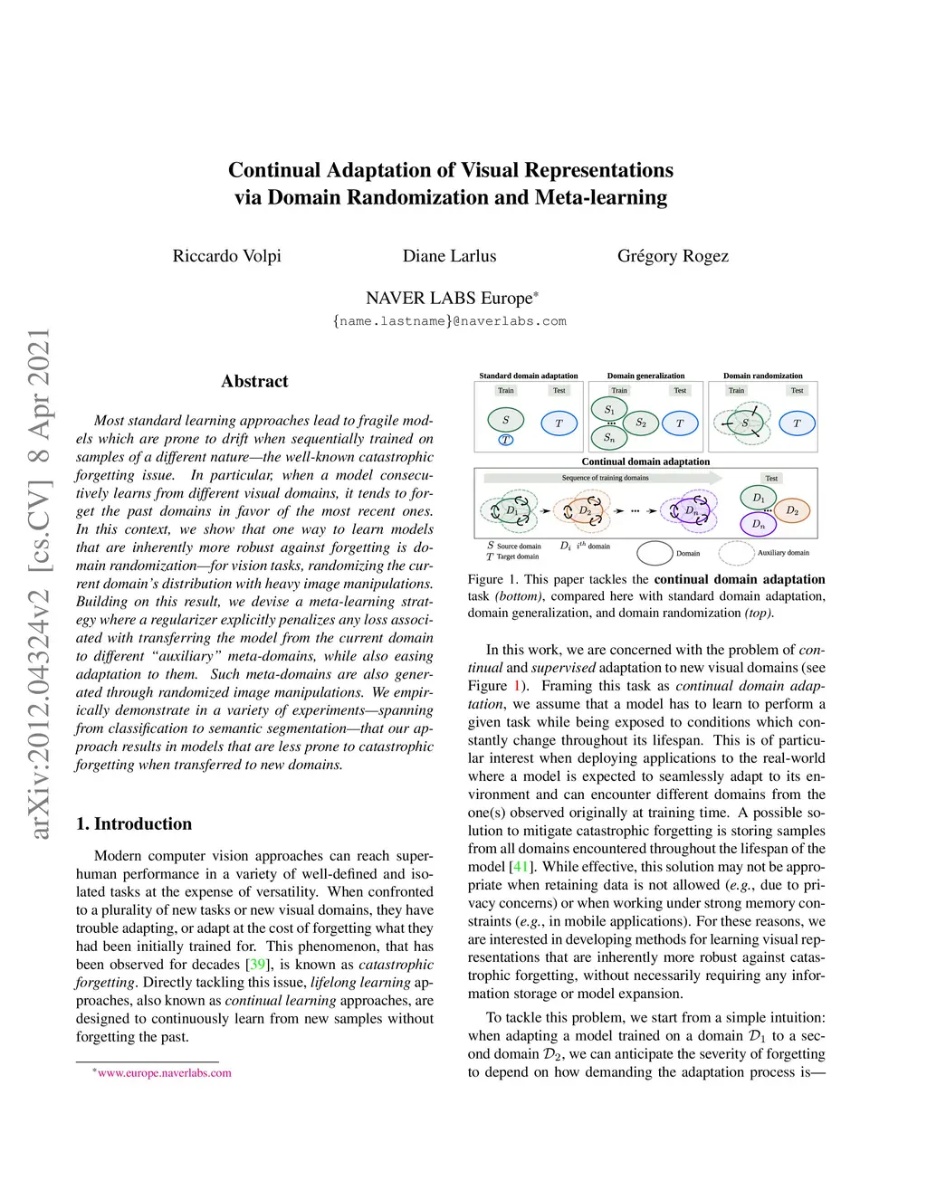 Most standard learning approaches lead to fragile models which are prone to drift when sequentially trained on samples of a different nature - the well-known "catastrophic forgetting" issue. In particular, when a model consecutively learns from different visual domains, it tends to forget the past domains in favor of the most recent ones. In this context, we show that one way to learn models that are inherently more robust against forgetting is domain randomization - for vision tasks, randomizing the current domain's distribution with heavy image manipulations. Building on this result, we devise a meta-learning strategy where a regularizer explicitly penalizes any loss associated with transferring the model from the current domain to different "auxiliary" meta-domains, while also easing adaptation to them. Such meta-domains are also generated through randomized image manipulations. We empirically demonstrate in a variety of experiments - spanning from classification to semantic segmentation - that our approach results in models that are less prone to catastrophic forgetting when transferred to new domains.