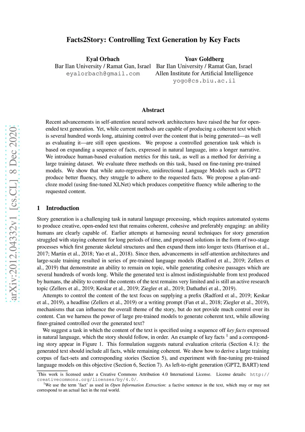 Facts2Story: Controlling Text Generation by Key Facts