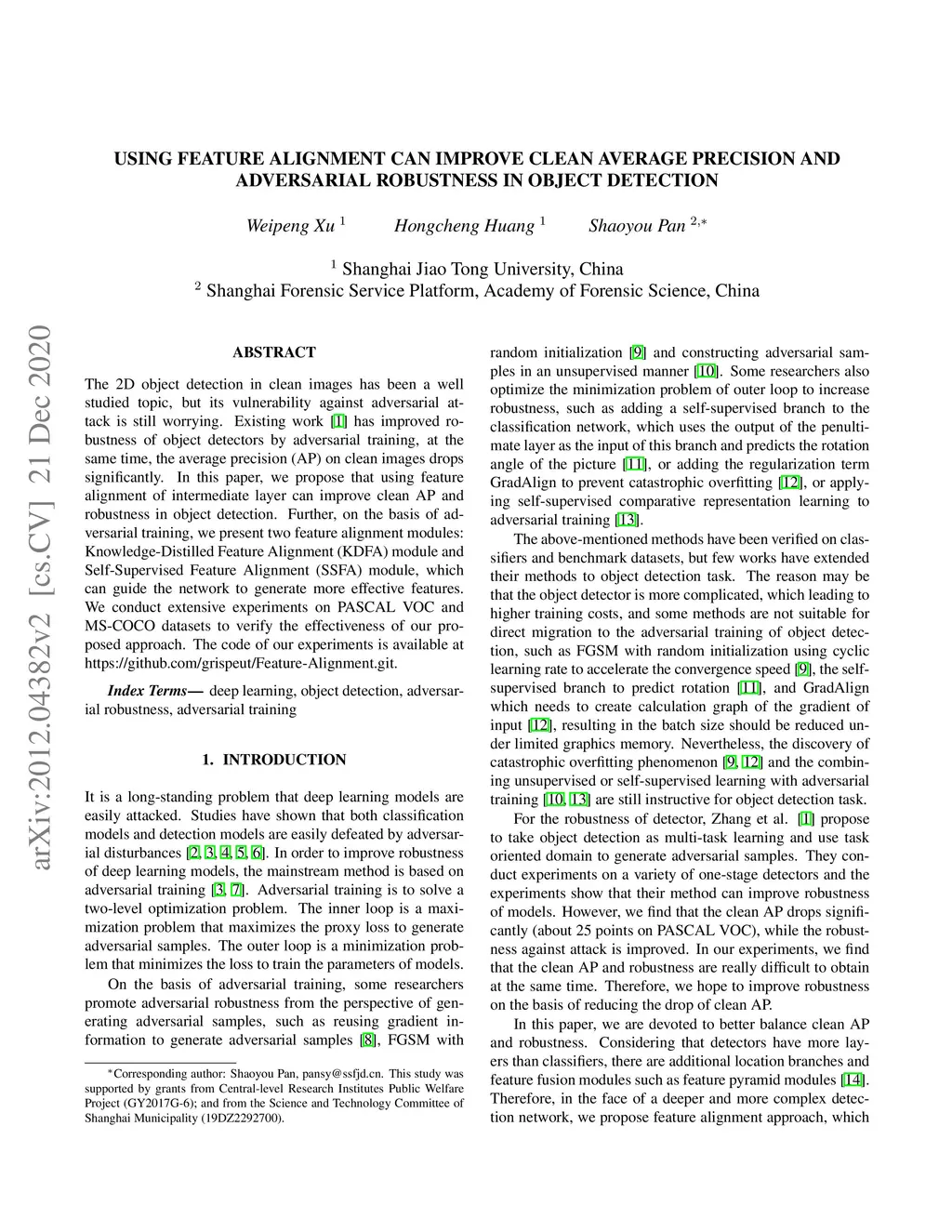 The 2D object detection in clean images has been a well studied topic, but its vulnerability against adversarial attack is still worrying. Existing work has improved robustness of object detectors by adversarial training, at the same time, the average precision (AP) on clean images drops significantly. In this paper, we propose that using feature alignment of intermediate layer can improve clean AP and robustness in object detection. Further, on the basis of adversarial training, we present two feature alignment modules: Knowledge-Distilled Feature Alignment (KDFA) module and Self-Supervised Feature Alignment (SSFA) module, which can guide the network to generate more effective features. We conduct extensive experiments on PASCAL VOC and MS-COCO datasets to verify the effectiveness of our proposed approach. The code of our experiments is available at https://github.com/grispeut/Feature-Alignment.git.
