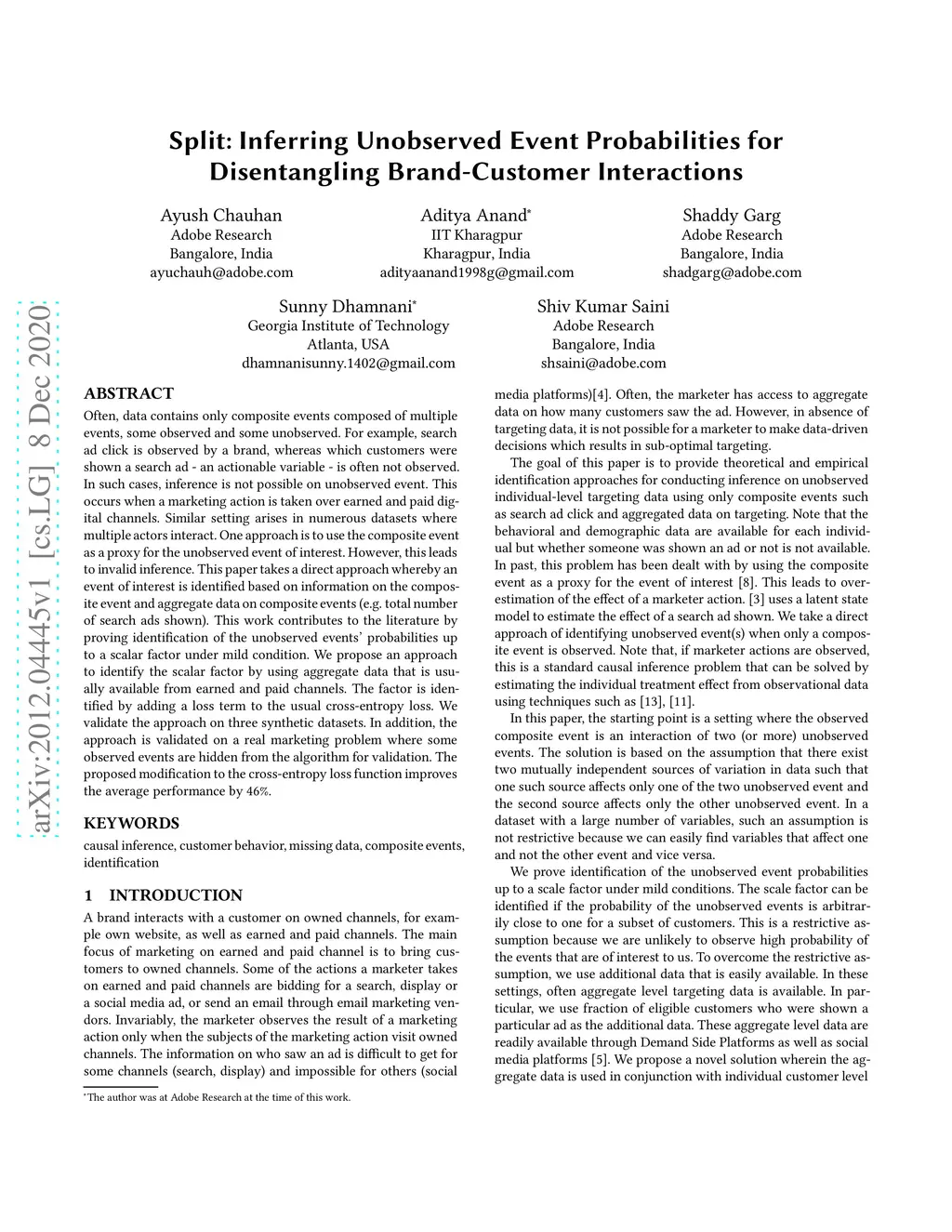 Often, data contains only composite events composed of multiple events, some observed and some unobserved. For example, search ad click is observed by a brand, whereas which customers were shown a search ad - an actionable variable - is often not observed. In such cases, inference is not possible on unobserved event. This occurs when a marketing action is taken over earned and paid digital channels. Similar setting arises in numerous datasets where multiple actors interact. One approach is to use the composite event as a proxy for the unobserved event of interest. However, this leads to invalid inference. This paper takes a direct approach whereby an event of interest is identified based on information on the composite event and aggregate data on composite events (e.g. total number of search ads shown). This work contributes to the literature by proving identification of the unobserved events' probabilities up to a scalar factor under mild condition. We propose an approach to identify the scalar factor by using aggregate data that is usually available from earned and paid channels. The factor is identified by adding a loss term to the usual cross-entropy loss. We validate the approach on three synthetic datasets. In addition, the approach is validated on a real marketing problem where some observed events are hidden from the algorithm for validation. The proposed modification to the cross-entropy loss function improves the average performance by 46%.