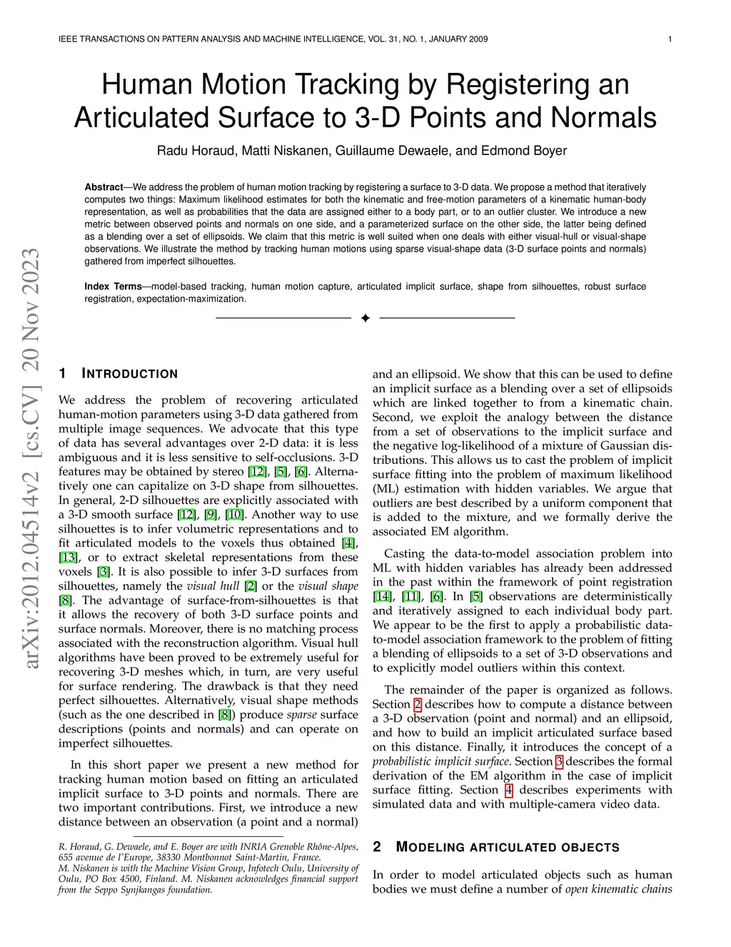 We address the problem of human motion tracking by registering a surface to 3-D data. We propose a method that iteratively computes two things: Maximum likelihood estimates for both the kinematic and free-motion parameters of a kinematic human-body representation, as well as probabilities that the data are assigned either to a body part, or to an outlier cluster. We introduce a new metric between observed points and normals on one side, and a parameterized surface on the other side, the latter being defined as a blending over a set of ellipsoids. We claim that this metric is well suited when one deals with either visual-hull or visual-shape observations. We illustrate the method by tracking human motions using sparse visual-shape data (3-D surface points and normals) gathered from imperfect silhouettes.