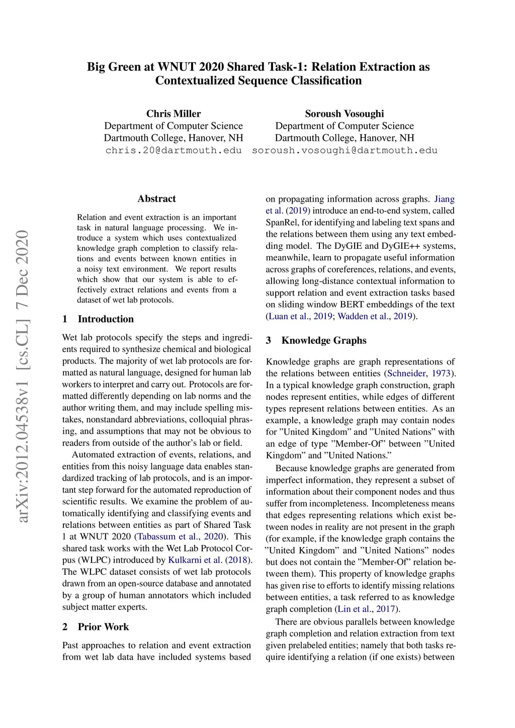 Big Green at WNUT 2020 Shared Task-1: Relation Extraction as