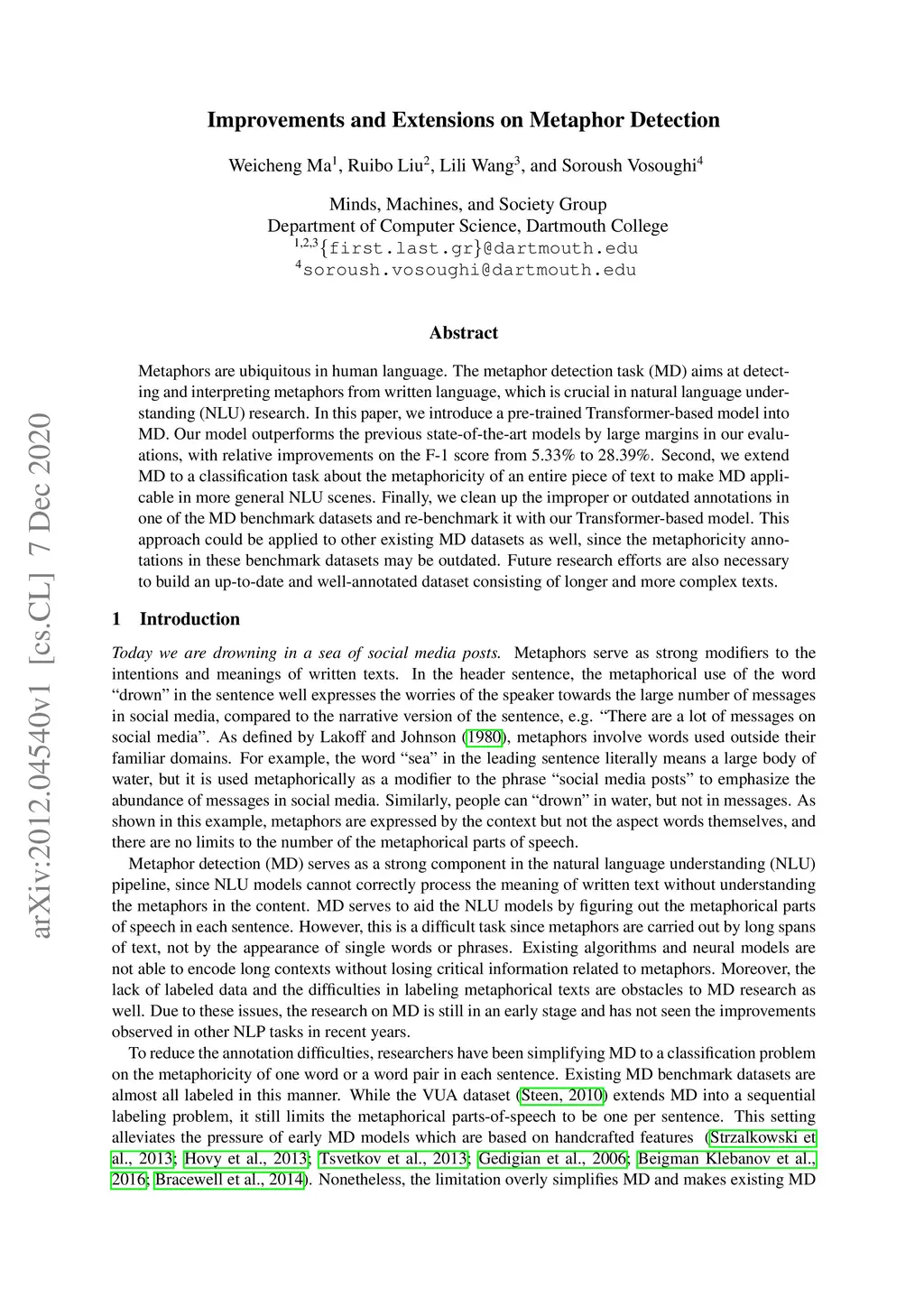 Metaphors are ubiquitous in human language. The metaphor detection task (MD) aims at detecting and interpreting metaphors from written language, which is crucial in natural language understanding (NLU) research. In this paper, we introduce a pre-trained Transformer-based model into MD. Our model outperforms the previous state-of-the-art models by large margins in our evaluations, with relative improvements on the F-1 score from 5.33% to 28.39%. Second, we extend MD to a classification task about the metaphoricity of an entire piece of text to make MD applicable in more general NLU scenes. Finally, we clean up the improper or outdated annotations in one of the MD benchmark datasets and re-benchmark it with our Transformer-based model. This approach could be applied to other existing MD datasets as well, since the metaphoricity annotations in these benchmark datasets may be outdated. Future research efforts are also necessary to build an up-to-date and well-annotated dataset consisting of longer and more complex texts.