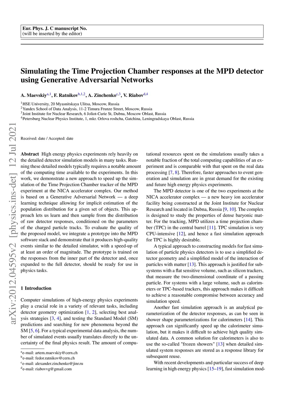High energy physics experiments rely heavily on the detailed detector simulation models in many tasks. Running these detailed models typically requires a notable amount of the computing time available to the experiments. In this work, we demonstrate a new approach to speed up the simulation of the Time Projection Chamber tracker of the MPD experiment at the NICA accelerator complex. Our method is based on a Generative Adversarial Network - a deep learning technique allowing for implicit estimation of the population distribution for a given set of objects. This approach lets us learn and then sample from the distribution of raw detector responses, conditioned on the parameters of the charged particle tracks. To evaluate the quality of the proposed model, we integrate a prototype into the MPD software stack and demonstrate that it produces high-quality events similar to the detailed simulator, with a speed-up of at least an order of magnitude. The prototype is trained on the responses from the inner part of the detector and, once expanded to the full detector, should be ready for use in physics tasks.