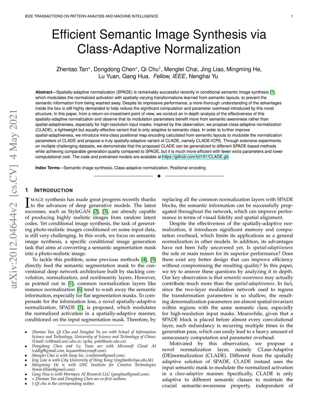 Spatially-adaptive normalization (SPADE) is remarkably successful recently in conditional semantic image synthesis \cite{park2019semantic}, which modulates the normalized activation with spatially-varying transformations learned from semantic layouts, to prevent the semantic information from being washed away. Despite its impressive performance, a more thorough understanding of the advantages inside the box is still highly demanded to help reduce the significant computation and parameter overhead introduced by this novel structure. In this paper, from a return-on-investment point of view, we conduct an in-depth analysis of the effectiveness of this spatially-adaptive normalization and observe that its modulation parameters benefit more from semantic-awareness rather than spatial-adaptiveness, especially for high-resolution input masks. Inspired by this observation, we propose class-adaptive normalization (CLADE), a lightweight but equally-effective variant that is only adaptive to semantic class. In order to further improve spatial-adaptiveness, we introduce intra-class positional map encoding calculated from semantic layouts to modulate the normalization parameters of CLADE and propose a truly spatially-adaptive variant of CLADE, namely CLADE-ICPE.Through extensive experiments on multiple challenging datasets, we demonstrate that the proposed CLADE can be generalized to different SPADE-based methods while achieving comparable generation quality compared to SPADE, but it is much more efficient with fewer extra parameters and lower computational cost. The code and pretrained models are available at \url{https://github.com/tzt101/CLADE.git}.