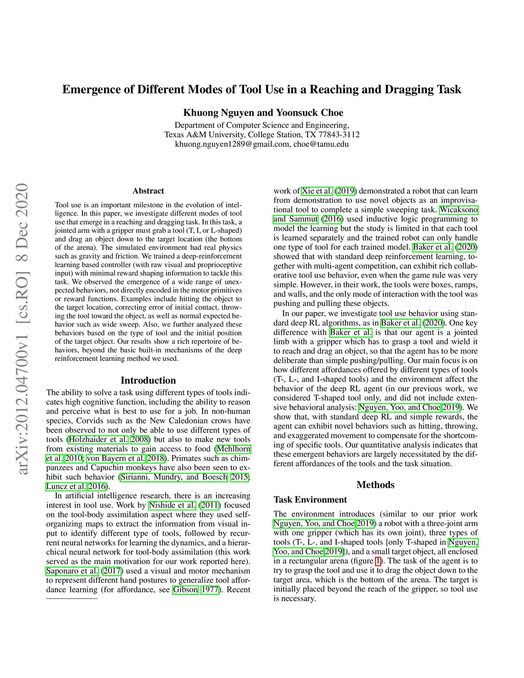 Tool use is an important milestone in the evolution of intelligence. In this paper, we investigate different modes of tool use that emerge in a reaching and dragging task. In this task, a jointed arm with a gripper must grab a tool (T, I, or L-shaped) and drag an object down to the target location (the bottom of the arena). The simulated environment had real physics such as gravity and friction. We trained a deep-reinforcement learning based controller (with raw visual and proprioceptive input) with minimal reward shaping information to tackle this task. We observed the emergence of a wide range of unexpected behaviors, not directly encoded in the motor primitives or reward functions. Examples include hitting the object to the target location, correcting error of initial contact, throwing the tool toward the object, as well as normal expected behavior such as wide sweep. Also, we further analyzed these behaviors based on the type of tool and the initial position of the target object. Our results show a rich repertoire of behaviors, beyond the basic built-in mechanisms of the deep reinforcement learning method we used.