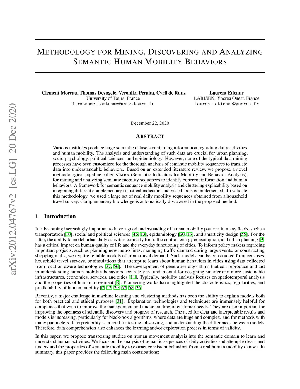 Various institutes produce large semantic datasets containing information regarding daily activities and human mobility. The analysis and understanding of such data are crucial for urban planning, socio-psychology, political sciences, and epidemiology. However, none of the typical data mining processes have been customized for the thorough analysis of semantic mobility sequences to translate data into understandable behaviors. Based on an extended literature review, we propose a novel methodological pipeline called simba (Semantic Indicators for Mobility and Behavior Analysis), for mining and analyzing semantic mobility sequences to identify coherent information and human behaviors. A framework for semantic sequence mobility analysis and clustering explicability based on integrating different complementary statistical indicators and visual tools is implemented. To validate this methodology, we used a large set of real daily mobility sequences obtained from a household travel survey. Complementary knowledge is automatically discovered in the proposed method.