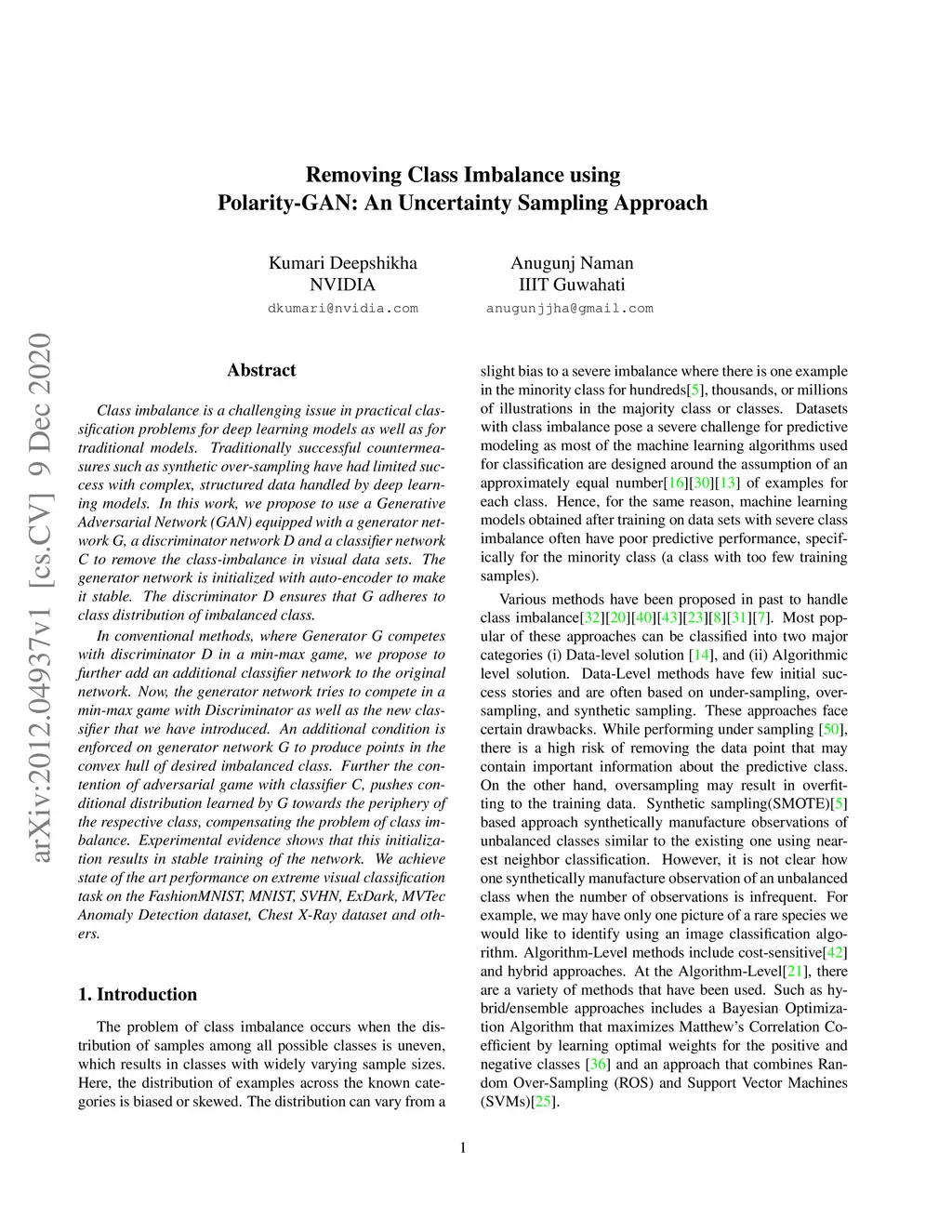 Removing Class Imbalance using Polarity-GAN: An Uncertainty Sampling