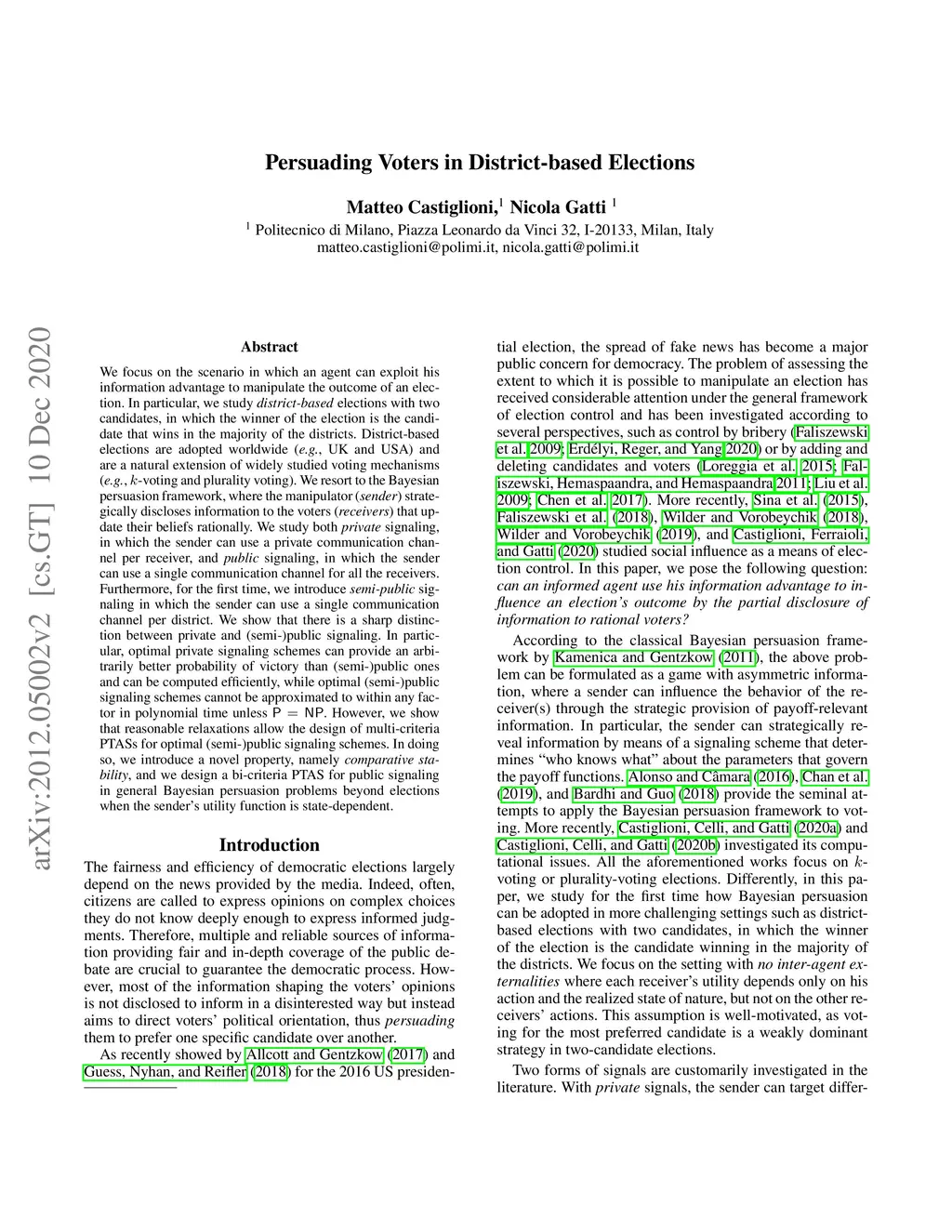 We focus on the scenario in which an agent can exploit his information advantage to manipulate the outcome of an election. In particular, we study district-based elections with two candidates, in which the winner of the election is the candidate that wins in the majority of the districts. District-based elections are adopted worldwide (e.g., UK and USA) and are a natural extension of widely studied voting mechanisms (e.g., k-voting and plurality voting). We resort to the Bayesian persuasion framework, where the manipulator (sender) strategically discloses information to the voters (receivers) that update their beliefs rationally. We study both private signaling, in which the sender can use a private communication channel per receiver, and public signaling, in which the sender can use a single communication channel for all the receivers. Furthermore, for the first time, we introduce semi-public signaling in which the sender can use a single communication channel per district. We show that there is a sharp distinction between private and (semi-)public signaling. In particular, optimal private signaling schemes can provide an arbitrarily better probability of victory than (semi-)public ones and can be computed efficiently, while optimal (semi-)public signaling schemes cannot be approximated to within any factor in polynomial time unless P=NP. However, we show that reasonable relaxations allow the design of multi-criteria PTASs for optimal (semi-)public signaling schemes. In doing so, we introduce a novel property, namely comparative stability, and we design a bi-criteria PTAS for public signaling in general Bayesian persuasion problems beyond elections when the sender's utility function is state-dependent.