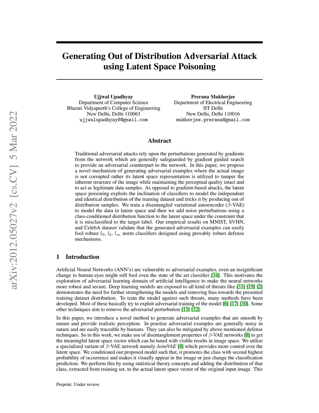 Traditional adversarial attacks rely upon the perturbations generated by gradients from the network which are generally safeguarded by gradient guided search to provide an adversarial counterpart to the network. In this paper, we propose a novel mechanism of generating adversarial examples where the actual image is not corrupted rather its latent space representation is utilized to tamper with the inherent structure of the image while maintaining the perceptual quality intact and to act as legitimate data samples. As opposed to gradient-based attacks, the latent space poisoning exploits the inclination of classifiers to model the independent and identical distribution of the training dataset and tricks it by producing out of distribution samples. We train a disentangled variational autoencoder (beta-VAE) to model the data in latent space and then we add noise perturbations using a class-conditioned distribution function to the latent space under the constraint that it is misclassified to the target label. Our empirical results on MNIST, SVHN, and CelebA dataset validate that the generated adversarial examples can easily fool robust l_0, l_2, l_inf norm classifiers designed using provably robust defense mechanisms.