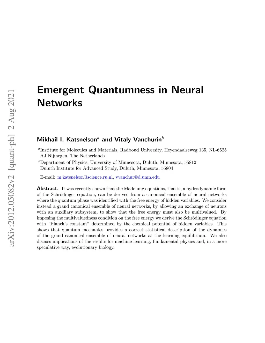 It was recently shown that the Madelung equations, that is, a hydrodynamic form of the Schr\"odinger equation, can be derived from a canonical ensemble of neural networks where the quantum phase was identified with the free energy of hidden variables. We consider instead a grand canonical ensemble of neural networks, by allowing an exchange of neurons with an auxiliary subsystem, to show that the free energy must also be multivalued. By imposing the multivaluedness condition on the free energy we derive the Schr\"odinger equation with "Planck's constant" determined by the chemical potential of hidden variables. This shows that quantum mechanics provides a correct statistical description of the dynamics of the grand canonical ensemble of neural networks at the learning equilibrium. We also discuss implications of the results for machine learning, fundamental physics and, in a more speculative way, evolutionary biology.