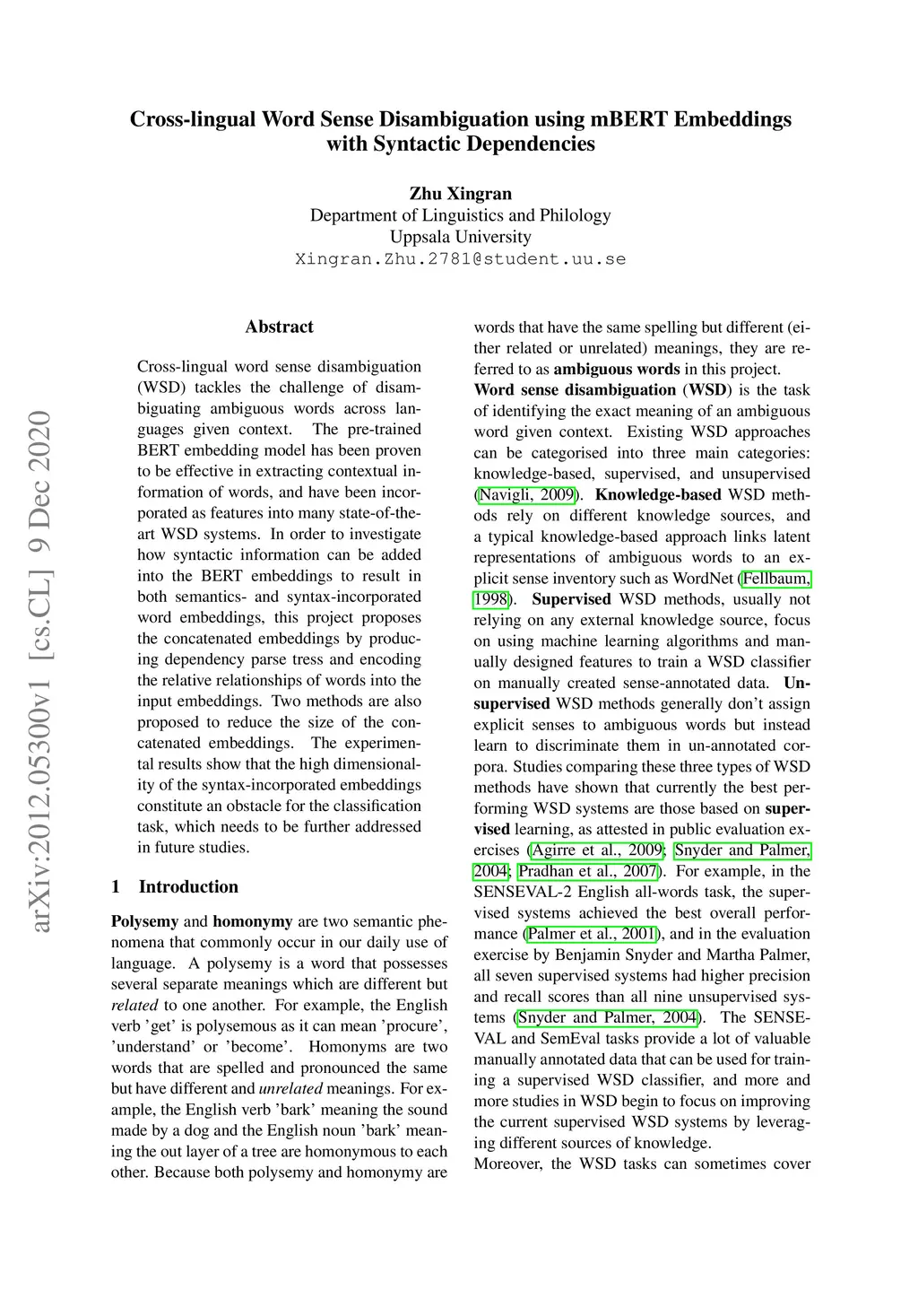 Cross-lingual word sense disambiguation (WSD) tackles the challenge of disambiguating ambiguous words across languages given context. The pre-trained BERT embedding model has been proven to be effective in extracting contextual information of words, and have been incorporated as features into many state-of-the-art WSD systems. In order to investigate how syntactic information can be added into the BERT embeddings to result in both semantics- and syntax-incorporated word embeddings, this project proposes the concatenated embeddings by producing dependency parse tress and encoding the relative relationships of words into the input embeddings. Two methods are also proposed to reduce the size of the concatenated embeddings. The experimental results show that the high dimensionality of the syntax-incorporated embeddings constitute an obstacle for the classification task, which needs to be further addressed in future studies.