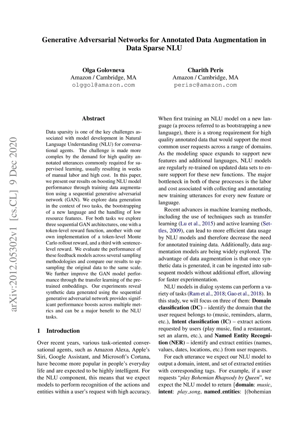 Data sparsity is one of the key challenges associated with model development in Natural Language Understanding (NLU) for conversational agents. The challenge is made more complex by the demand for high quality annotated utterances commonly required for supervised learning, usually resulting in weeks of manual labor and high cost. In this paper, we present our results on boosting NLU model performance through training data augmentation using a sequential generative adversarial network (GAN). We explore data generation in the context of two tasks, the bootstrapping of a new language and the handling of low resource features. For both tasks we explore three sequential GAN architectures, one with a token-level reward function, another with our own implementation of a token-level Monte Carlo rollout reward, and a third with sentence-level reward. We evaluate the performance of these feedback models across several sampling methodologies and compare our results to upsampling the original data to the same scale. We further improve the GAN model performance through the transfer learning of the pretrained embeddings. Our experiments reveal synthetic data generated using the sequential generative adversarial network provides significant performance boosts across multiple metrics and can be a major benefit to the NLU tasks.
