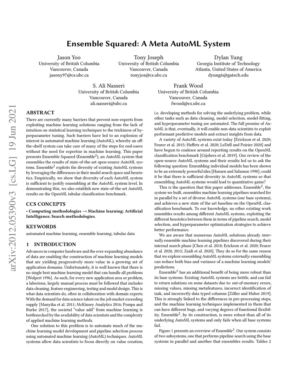 There are currently many barriers that prevent non-experts from exploiting machine learning solutions ranging from the lack of intuition on statistical learning techniques to the trickiness of hyperparameter tuning. Such barriers have led to an explosion of interest in automated machine learning (AutoML), whereby an off-the-shelf system can take care of many of the steps for end-users without the need for expertise in machine learning. This paper presents Ensemble Squared (Ensemble2^2), an AutoML system that ensembles the results of state-of-the-art open-source AutoML systems. Ensemble2^2 exploits the diversity of existing AutoML systems by leveraging the differences in their model search space and heuristics. Empirically, we show that diversity of each AutoML system is sufficient to justify ensembling at the AutoML system level. In demonstrating this, we also establish new state-of-the-art AutoML results on the OpenML tabular classification benchmark.
