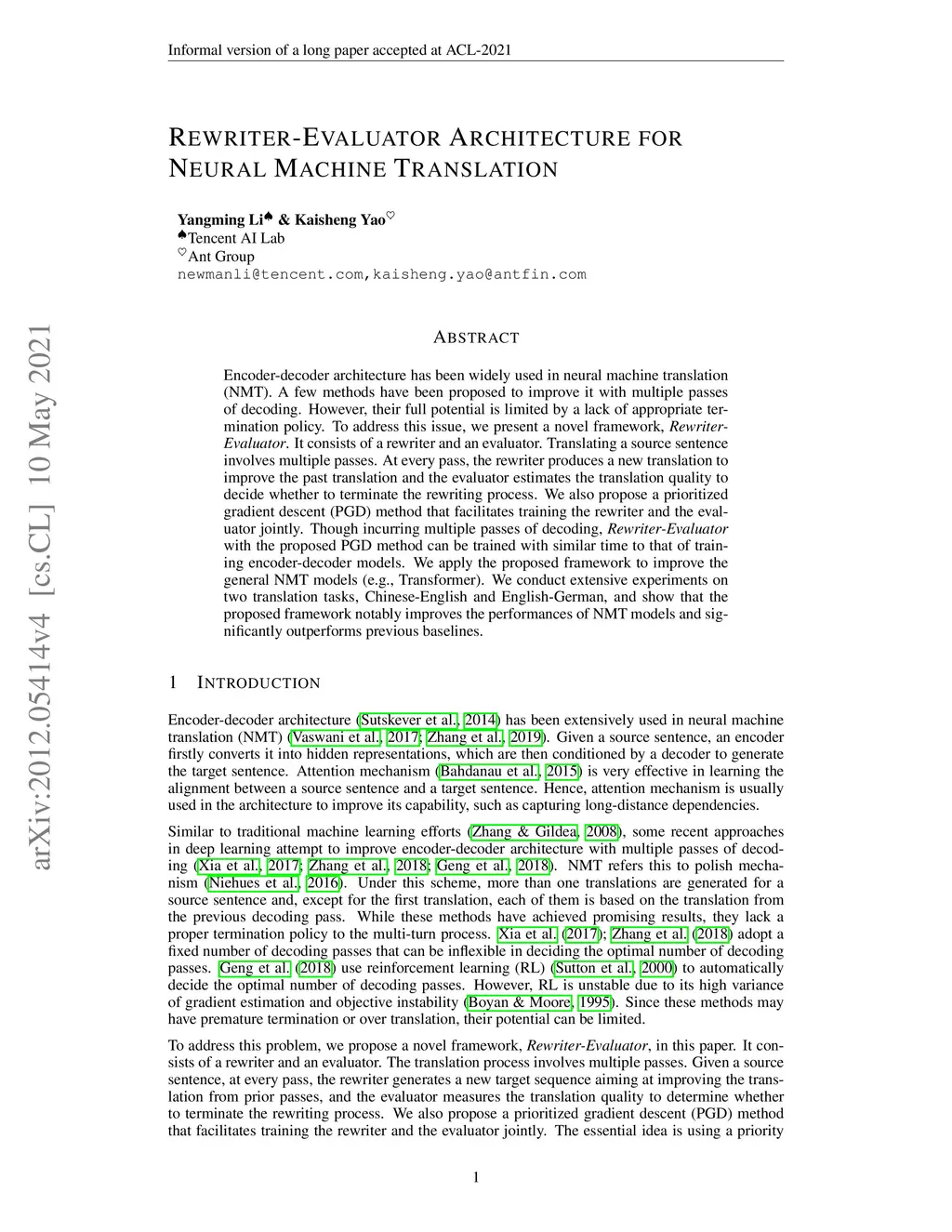 Rewriter-Evaluator Architecture for Neural Machine Translation